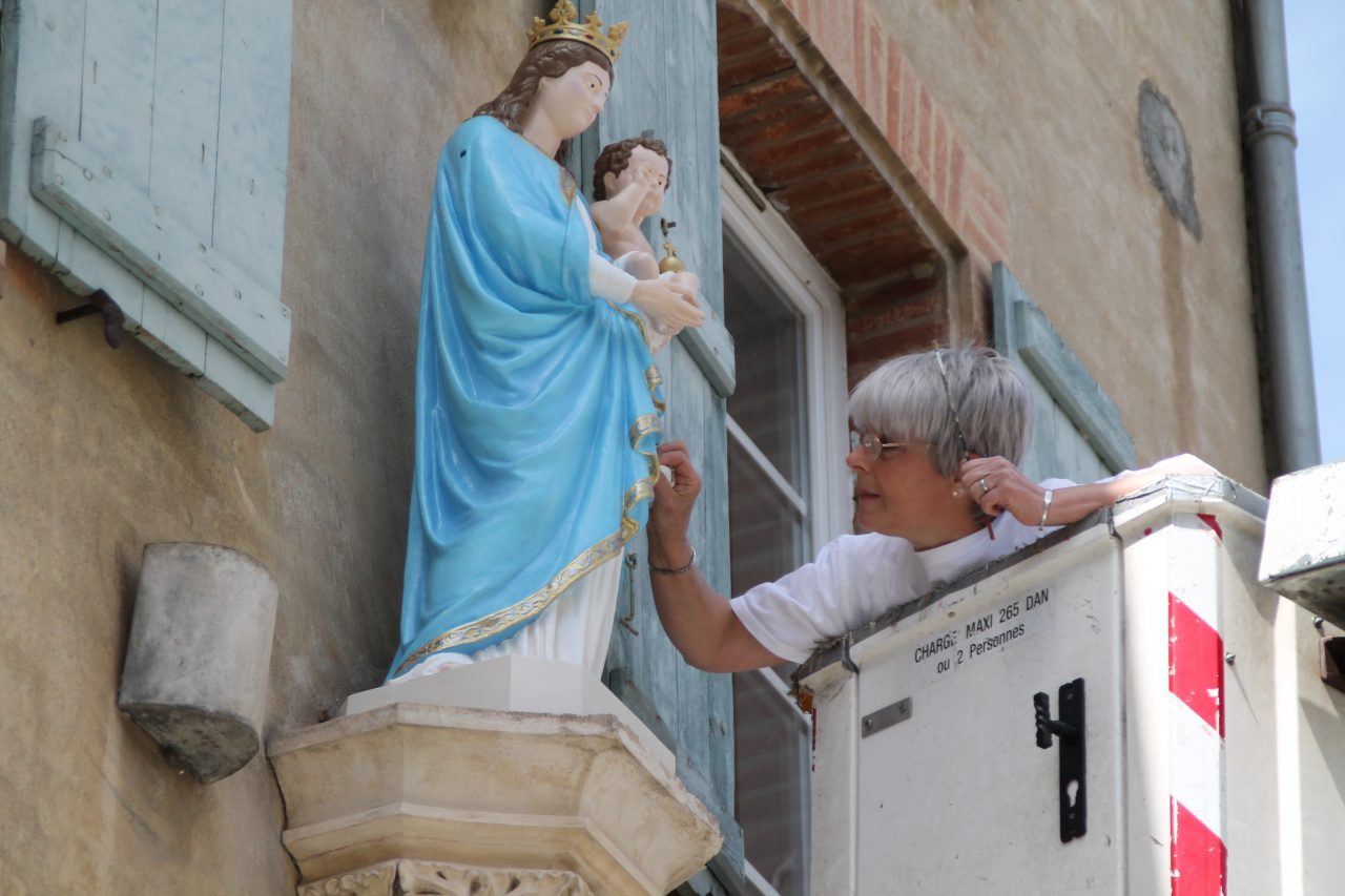 La remise en place, réalisée par les services municipaux, ne fut pas simple. Il fallait hisser la statue, d’un poids d’environ 130 kilos, sur le support situé à environ 5 mètres du sol et la nacelle ne pouvait contenir que deux personnes. Une fois la statue positionnée, Madame Bonnemaison est montée à son tour pour corriger les derniers détails d’ombrages et de contrastes, afin de rendre un travail parfait.