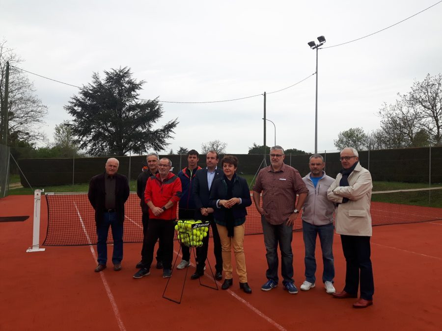 Maryse Vezat: à sa droite, le président de la ligue Midi-Pyrénées Laurent Darcos, Axel Lefranc, professeur de tennis. Les élus, Michel Audoubert, Bernard Pons, Yves Caron-Jourda. A sa gauche, Daniel Escorihuela, Michel Sorroche vice-président, Jean-Michel Higo secrétaire.
