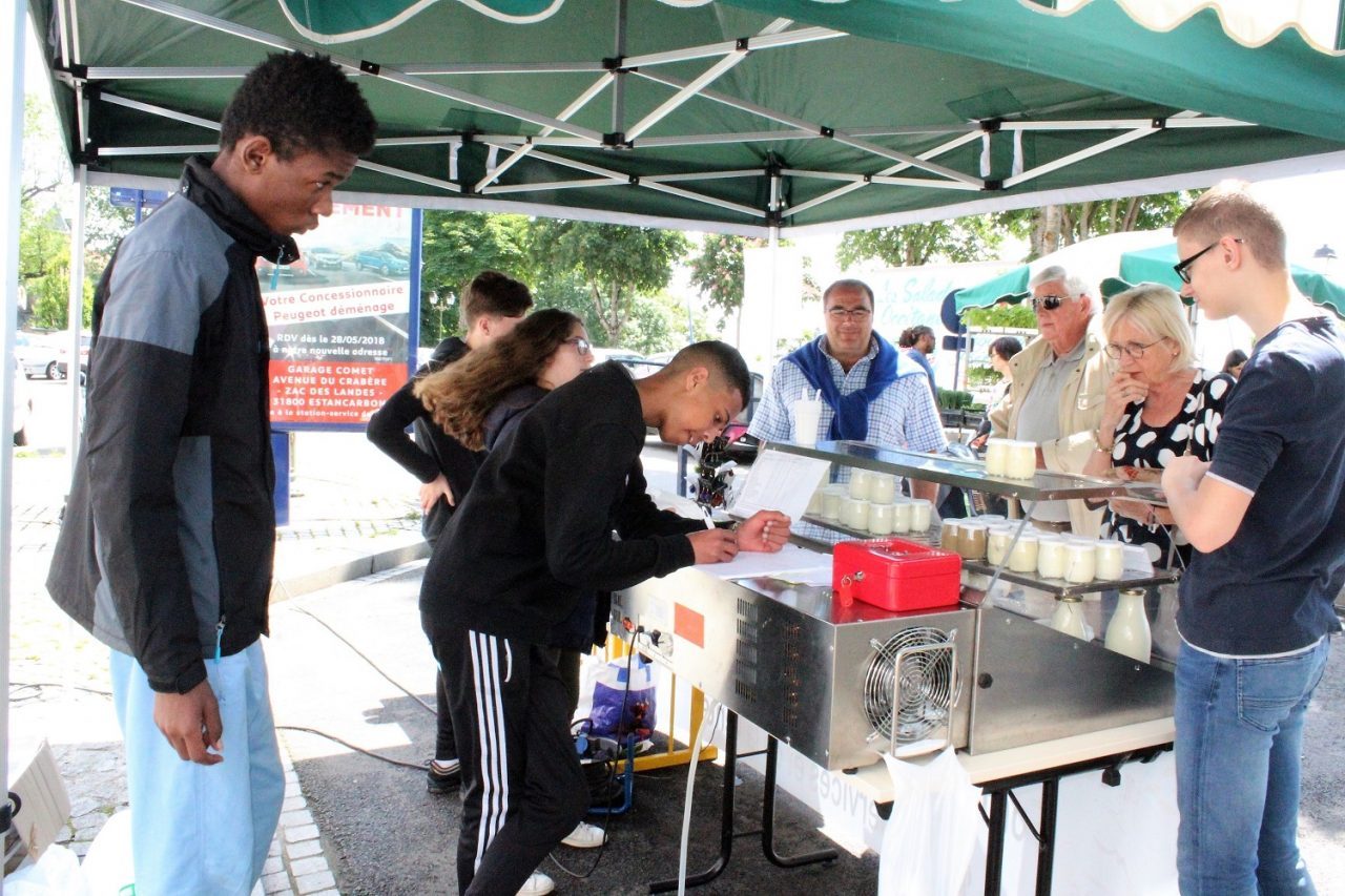 Pour Pascal Bibès, leur professeur, rien ne vaut la pratique, la confrontation aux clients pour assimiler la théorie apprise en classe. C’est le sourire aux lèvres qu’ils vous expliquent les procès de fabrication. Du lait issu de la cinquantaine de laitières de la ferme jusqu’au pot de yaourt ou du beurre que vous trouvez dans la vitrine réfrigérante. Leur clientèle progresse au fur et à mesure des marchés. D’ailleurs, une, très assidue, vient se fournir régulièrement à la ferme.
