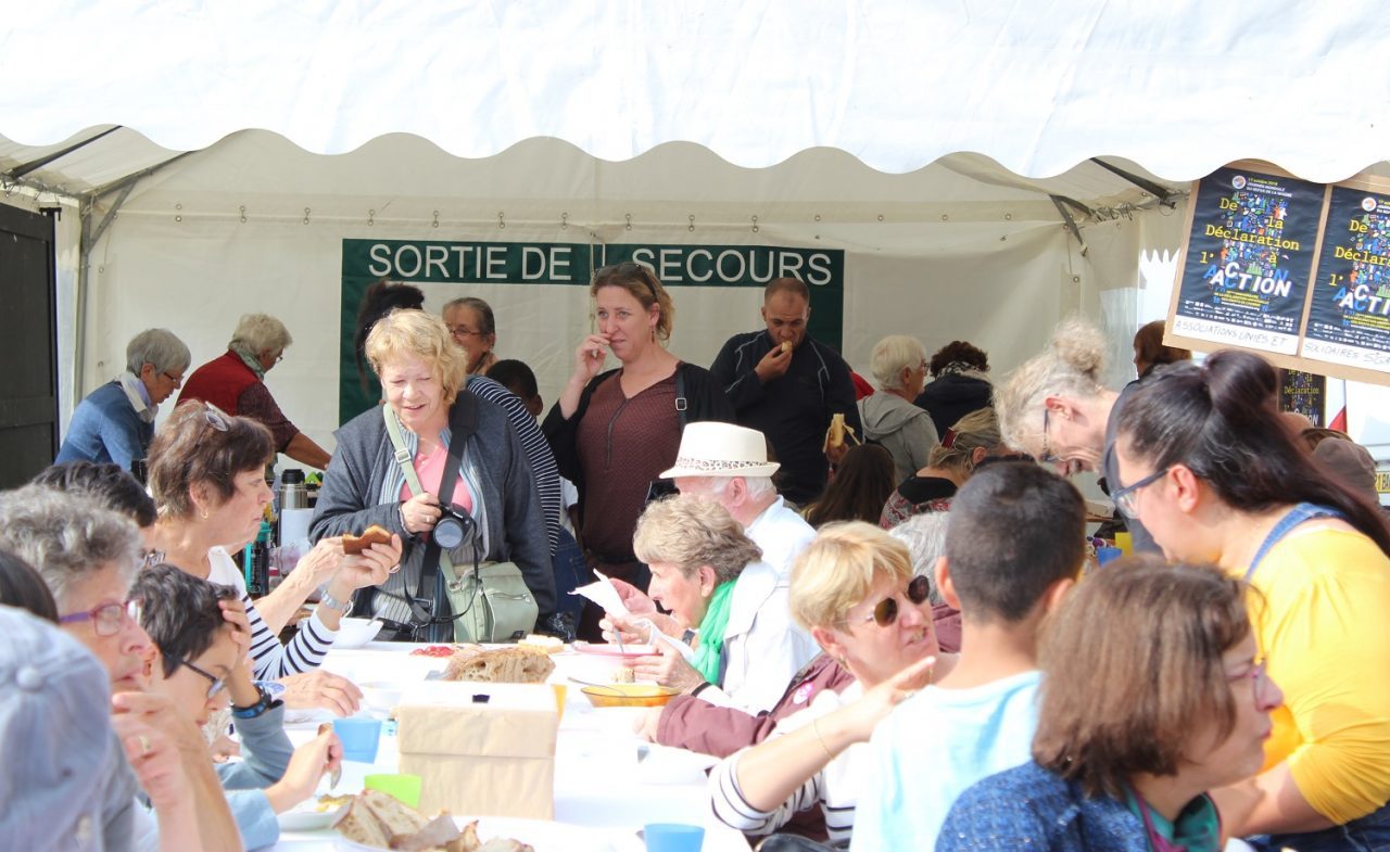 La Bio-coop a fourni des légumes ainsi que les bénévoles ou des dons qui ont agrémenté le repas. Cela se voulait un repas de convivialité et de solidarité, pour dire non à la misère, à la peur de l’autre, une main tendue à la différence. Le groupe Les Lélé a assuré l’animation avec ses compositions humoristiques et parfois sarcastiques, ce qui a interpellé le passant curieux. Tous étaient invités à partager une soupe généreuse, assis ensemble, sans différences, sous un magnifique soleil d’automne.
