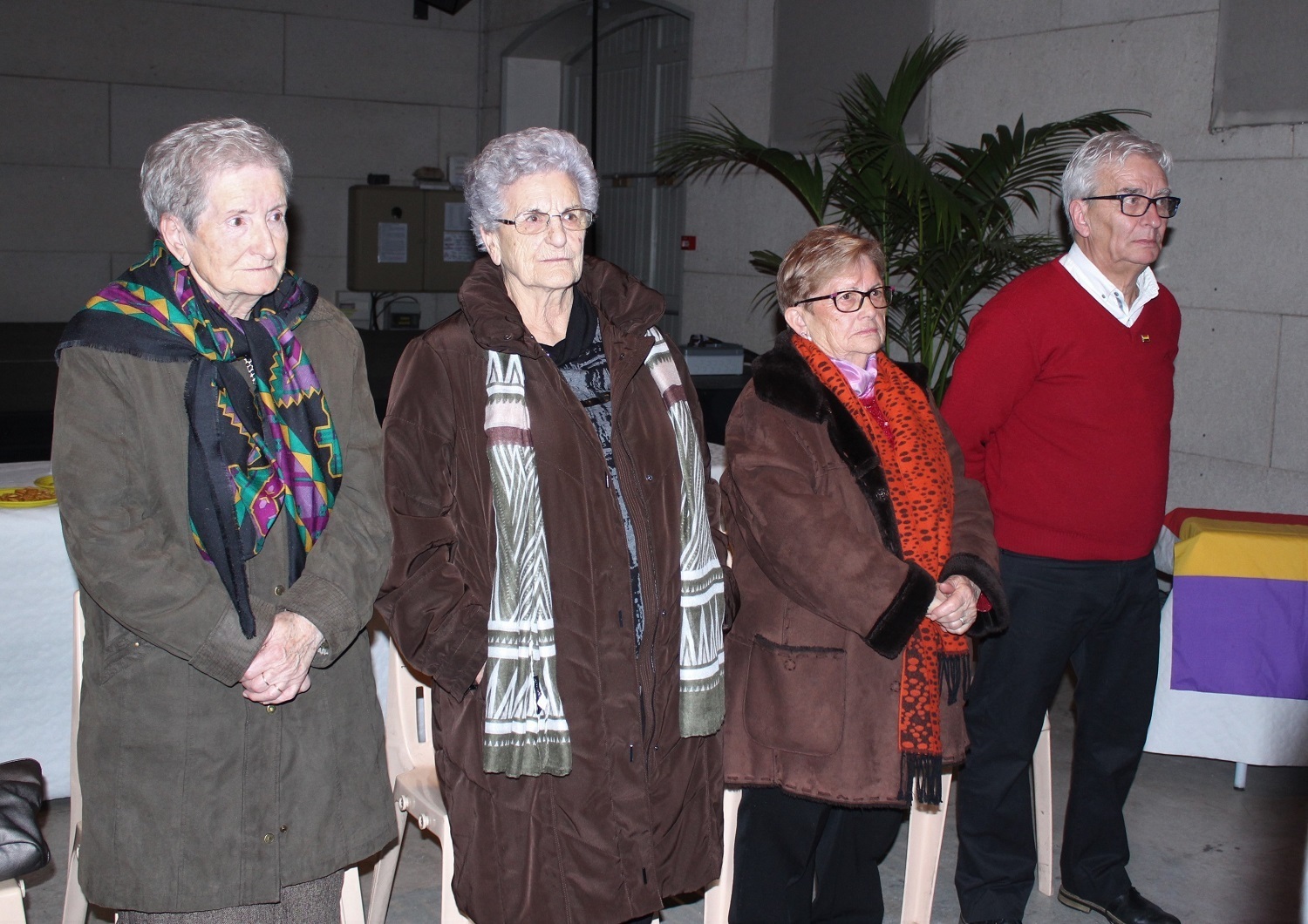 Accueil » Commémoration des 80 ans de la Retirada » 20190201-Joséphine Puentedura, Constantine Leconte, Ginette Rubiella, Jules Estaran lors de l’hymne républicain Espagnol