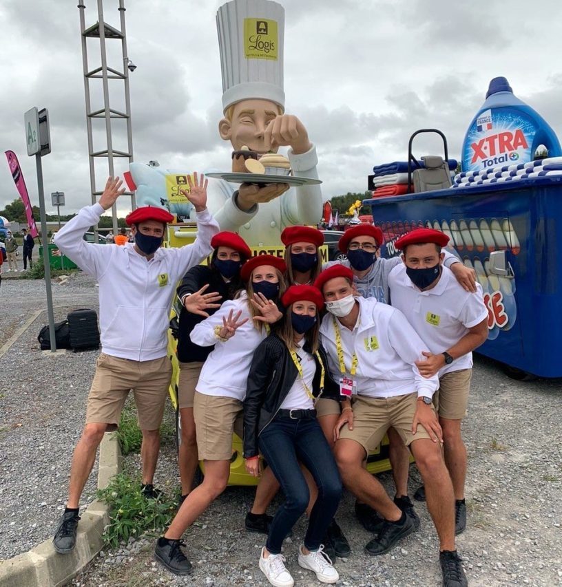 Dans l’équipe, outre Flavien, il y a Lucie, Thibault, Salomé, Grégory, Léa et Gauthier, mon chauffeur (tous se sont donnés de nouveaux prénoms anciens pour le TDF). Bordelais, 22 ans, en cinquième année de master comptabilité. « La rentrée, c’était lundi dernier », confie-t-il. « Mais, depuis tout petit, mes parents m’emmenaient voir passer le Tour de France. J’ai une vraie passion pour le vélo. Alors quand j’ai su que j’étais sélectionné, j’ai sauté sur l’occasion. Je rattraperai les cours ». Gauthier se destine à une profession d’expert-comptable ou plutôt de directeur financier. Huit jours de formation sont nécessaires pour intégrer la caravane.