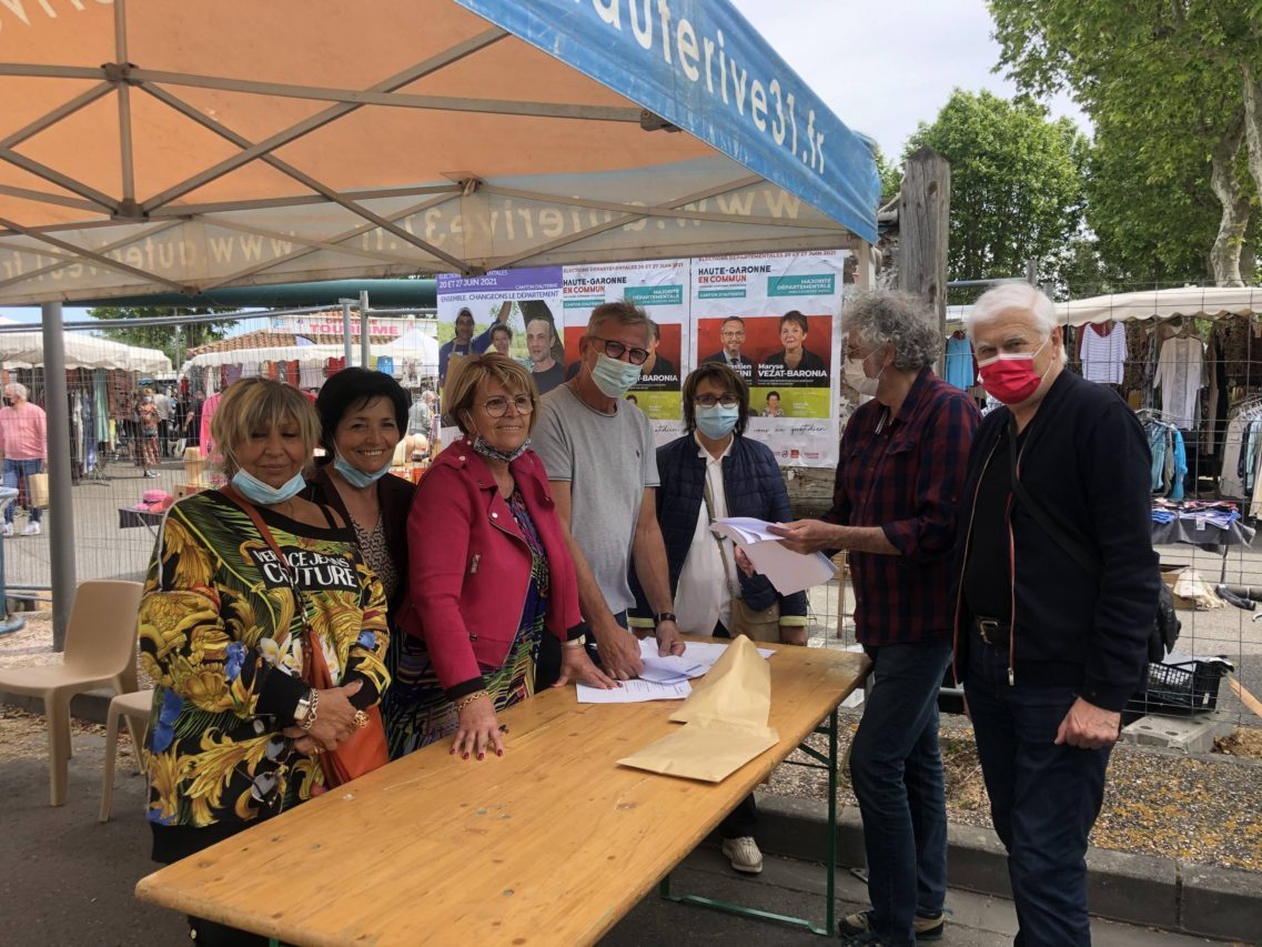 Les trois élus municipaux , Mme Delaveau Hamann, Mme Cavalieri D’Oro et Mr Ponthieu entourés de Mr le Maire René Azema , de Mr Massacrier adjoint au maire de Mme Duprat adjointe au Maire et de bénévoles qui ont participé aux réunions de travail, ont tenu un bureau de vote sur le marché.