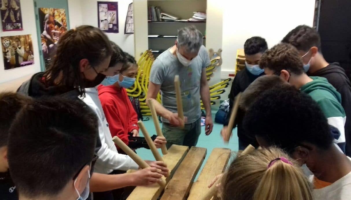 Les élèves de la classe de 5°3 du collège Bertrand Laralde accueillaient ce vendredi 4 Juin, Thierry Biscary pour une initiation à la txalaparta.