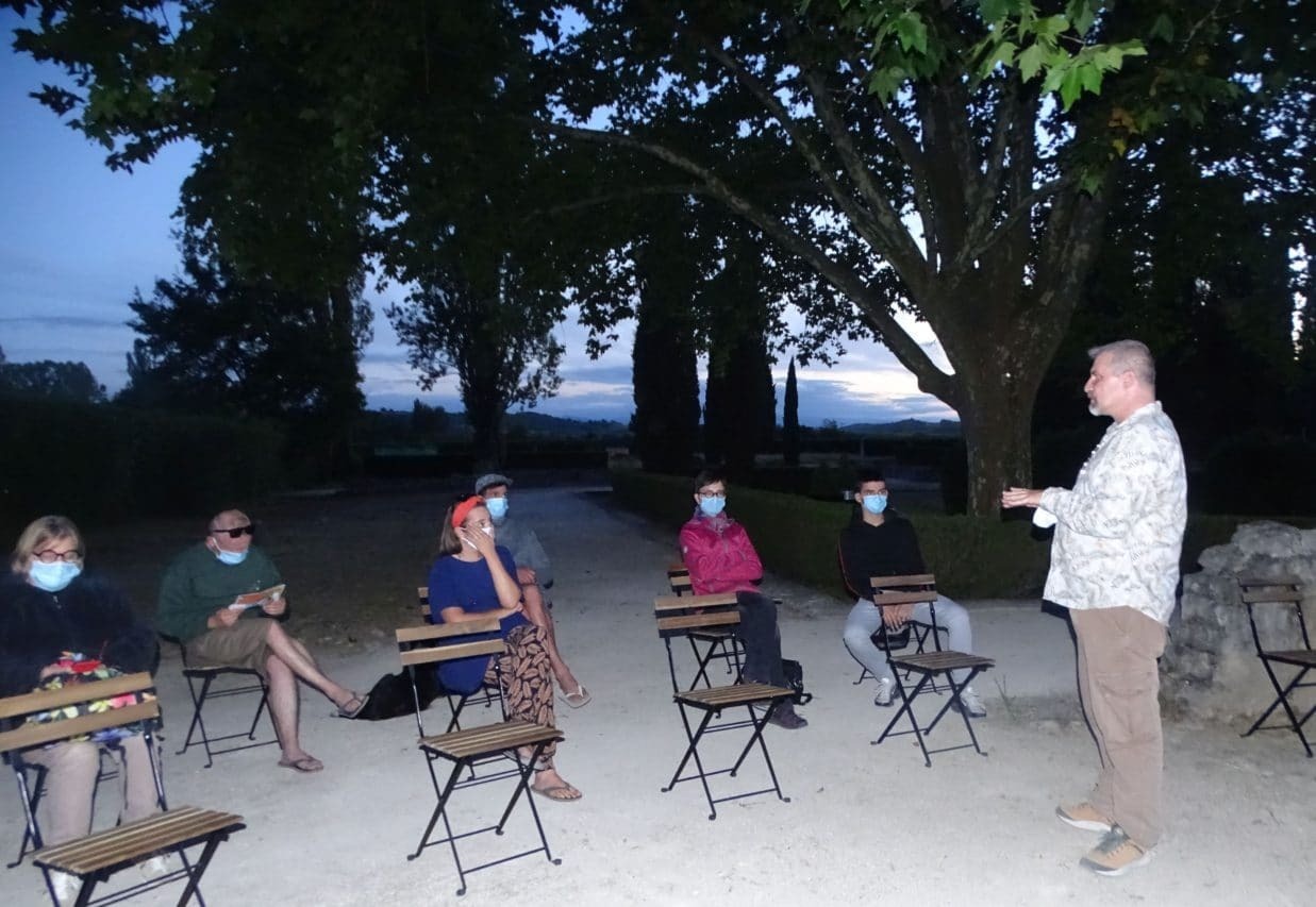 A la suite de sa passionnante conférence, Pascal Giraudel a emmené le groupe déambuler dans les allées minérales des vestiges de la villa, à l’écoute des petits chiroptères ailés en chasse d’insectes nocturnes. A l’aide d’un matériel adapté, il était possible de surprendre leurs échos furtifs dans la nuit d’été. Un moment magique.