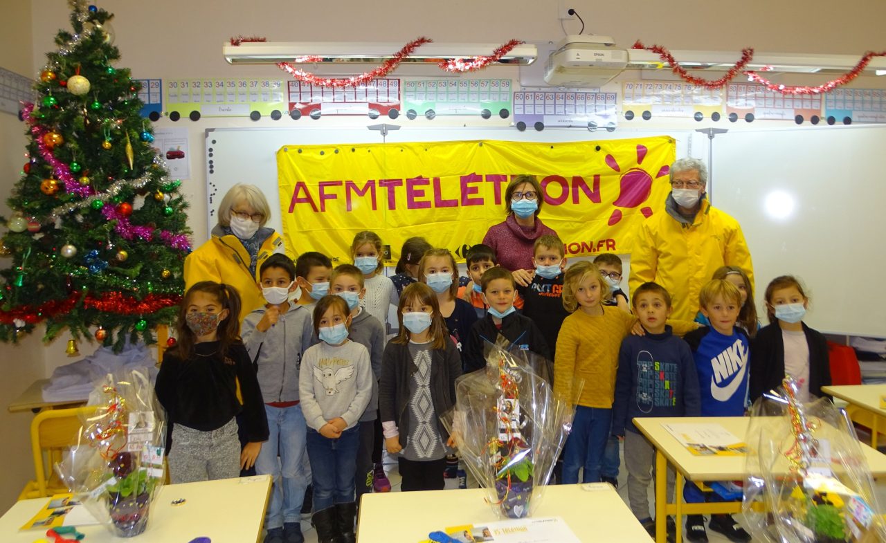 « Les élèves concernés, grande section, CP CE1, ont été réactifs et contents de participer. On a travaillé sur les mots du Téléthon, ce que ça évoquait pour eux, cohésion, solidarité, générosité, guérir, soigner, etc. Ils ont ensuite choisi chacun les mots qu’ils préféraient, les ont écrits sur une pique décorative fichée dans le pot fleuri. » Les objets réalisés par les élèves ont été mis en vente à l’école au profit de l’AMF-Téléthon (association française contre les myopathies).