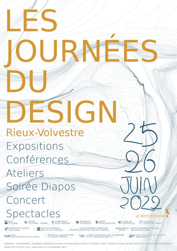 Le Petit Perchoir a organisé tout au long de l’année scolaire des ateliers de design au sein de l’école primaire de Rieux-Volvestre. Encadrés par des professionnels du design, les élèves ont conçu des objets et une police de caractère qui est utilisée sur les supports de communication de l’événement. De plus, des étudiants de différentes écoles de design de Toulouse viendront présenter leurs projets de fin d’étude.