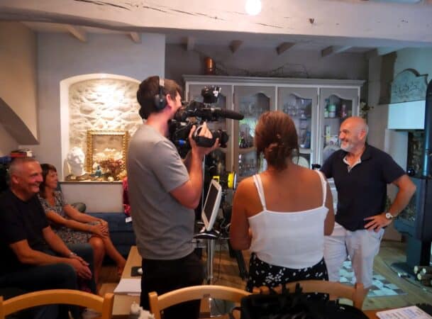 Ainsi, Eric Balat, propriétaire des lieux, narrait son aventure de fermette sponsorisée. L’équipe est restée plusieurs jours et a découvert, entre autres, l’Albatière, enduit intérieur et extérieur conçu par Eric. Un des sponsors était présent cet après-midi de tournage et apparaîtra à l’écran, Fabienne et Cyril Tonelli de la boutique du poêle à Estancarbon. Cette entreprise, dans le cadre du sponsoring, avait offert un poêle à bois à Eric Balat. « Cela va au-delà du sponsoring », indique Eric. « Des amitiés se sont nouées entre nous. Si j’ai invité ce couple aujourd’hui, c’est pour les remercier et booster leur activité en passant dans l’émission. » Ce que confirme Cyril qui est déjà passé dans un reportage consacré à la fermette. « Dans la semaine qui a suivi, il y a eu beaucoup plus de visites au magasin. Il y a eu un millier de vues sur Facebook. Si le film d’Eric sort, ce que je lui souhaite, cela va être pareil. »