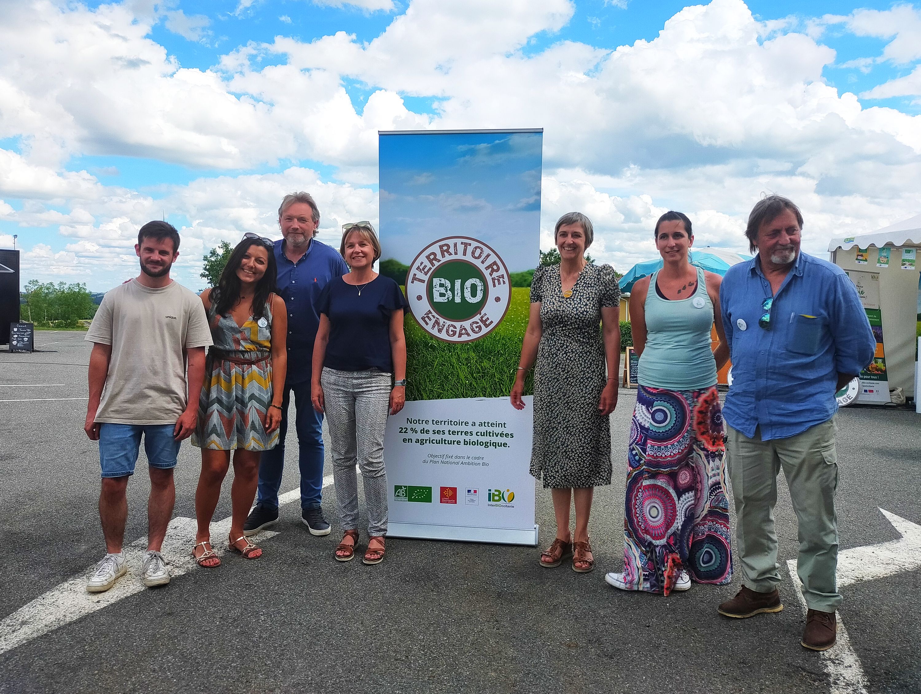 Accueil » Saint Blancard : La Route des Territoires bio Engagés s’est arrêtée au village » Christine Hupper maire de Saint Blancard (à dr du panneau) et les acteurs de la journée événement des Territoires bio Engagés.