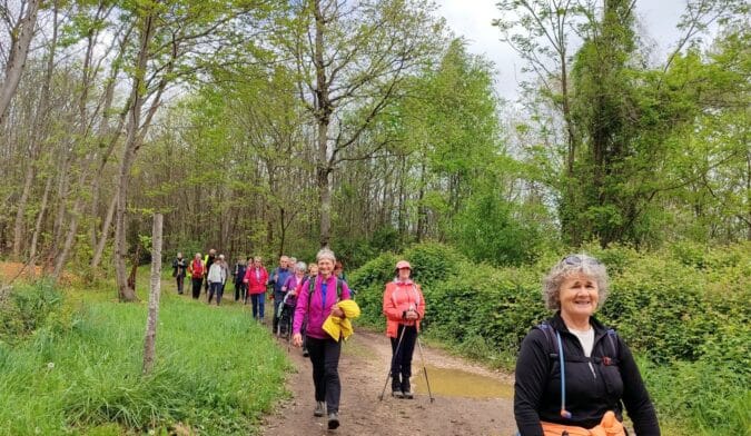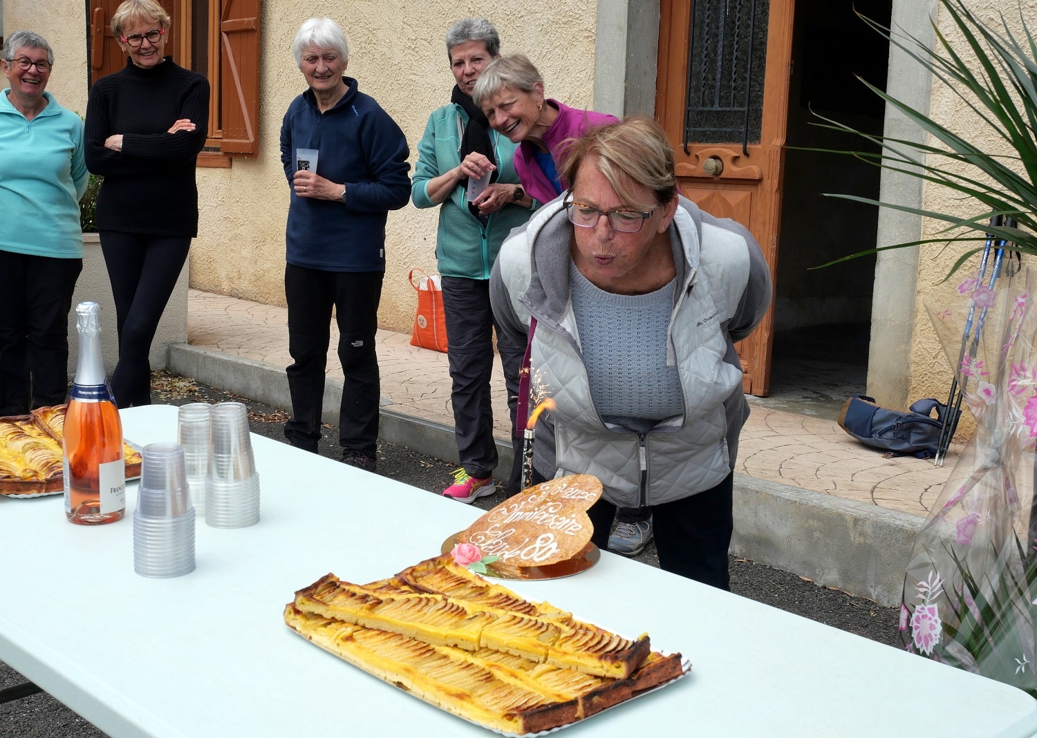 La raison : les 80 ans (et un jour), de Claude, une fidèle parmi les fidèles qui pratique surtout la marche santé. Elle recevait une jolie plante offerte par le club. Après que la bougie ait été soufflée et les pâtisseries offertes par le club dégustées, place à la photo souvenir et à la deuxième marche.