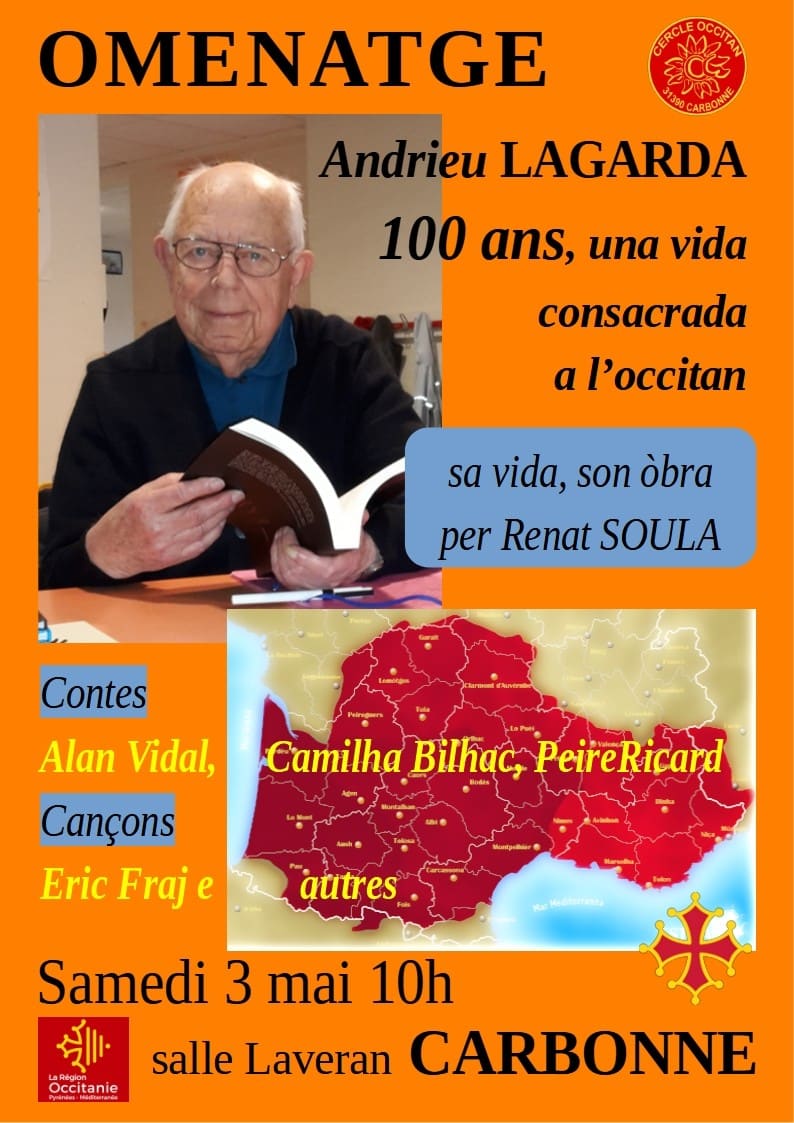 Samedi 3 mai:Le Cercle Occitan de Carbonne et du Volvestre fêtera los 100 ans d’Andrieu Lagarda avec une « parladissa omenatge », rendez-vous à 10h, à la salle Laveran de Carbonne.