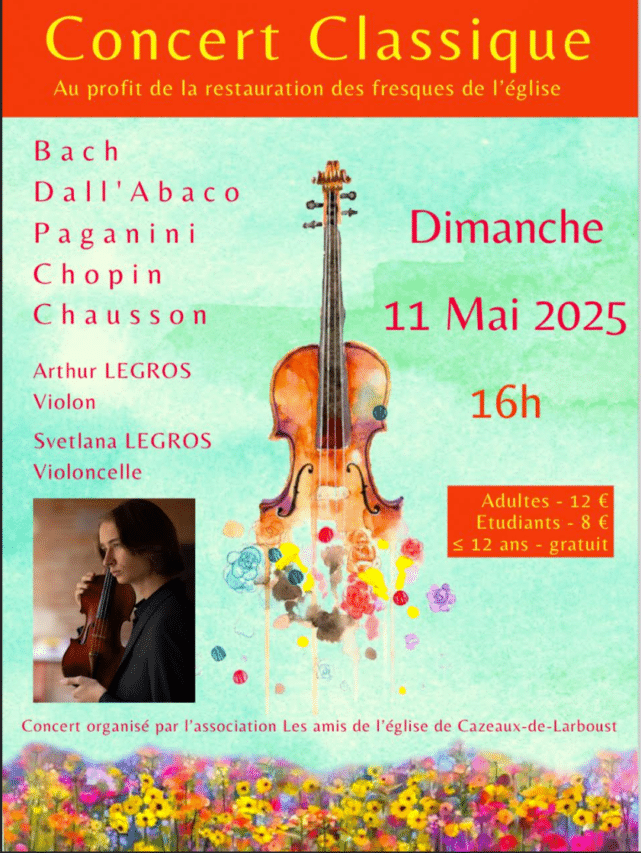 Dimanche 11 Mai, à 16h, l’église Ste Anne de Cazeaux de Larboust aura le plaisir de recevoir Svetlana et Arthur Legros (violoncelle, violon) qui offriront un concert classique en interprétant des œuvres de Bach, Chopin, Paganini, Chausson, Dall’Abaco ; l’an passé, ils avaient déjà enchanté l’assistance par leur virtuosité, donc retenez cette date en vous rappelant que l’église n’est pas très grande…donc arrivez un peu avant l’heure !