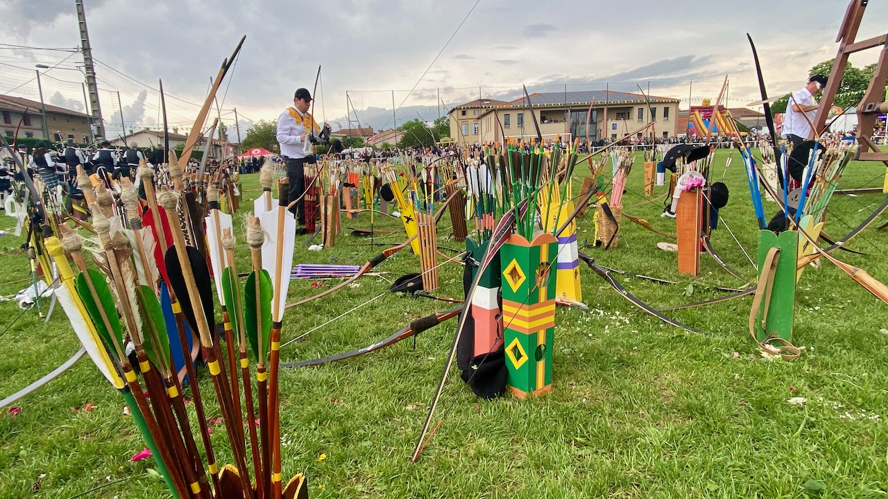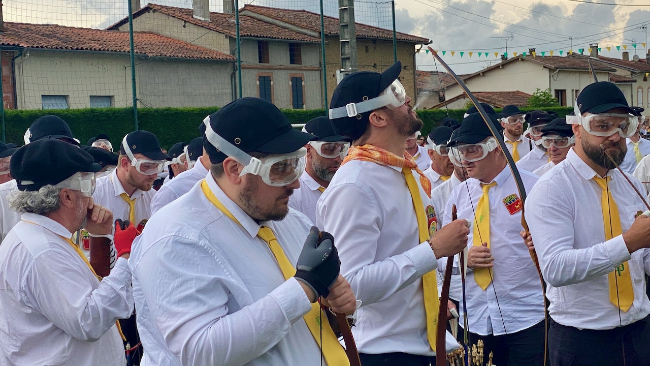 C’est au pied du mât que chacun a pu mesurer le pourquoi, au delà de cette brusque disparition tragique, de la tension palpable qui régnait cette année dans l’organisation du Papogay. Contrairement à d’habitude à l’arrivée des archers sous le mât, ils se sont écartés à l’écart de la vue des spectateurs pendant un long moment pour aller récupérer des casquettes et des lunettes de protection dont ils se sont équipées (voir photo). Une première depuis la création de la compagnie au moyen âge. Force est de constater que si la protection est efficace puisqu’il n’y a eu aucun blessé recensé à la tête cette année, il en était tout autre de l’esthétique des archers ressemblant plus à des personnages d’un film comique qu’à des guerriers portant leur béret gascon traditionnel. De ci de là, on a pu entendre que certains ronchonnaient en s’équipant, d’autres refusant même de tirer à l’oiseau à titre de protestation contestant le fait accompli et le manque de concertation ce qui nie le bureau par ailleurs. Tout cela devrait se régler entre amoureux de la tradition qui les unit lors de la prochaine assemblée générale, chacun voulant privilégier l’intérêt commun de la compagnie et la préservation de l’esprit qui anime cette compagnie depuis le moyen âge.