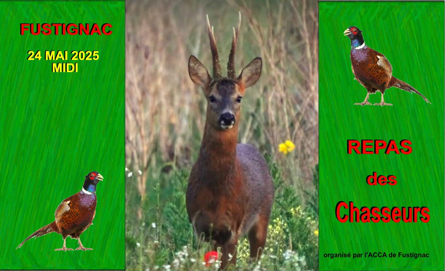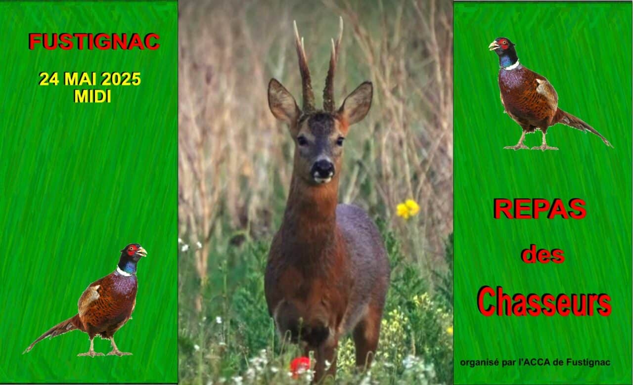Le samedi 24 mai 2025 à midi l’ACCA* de Fustignac organise le repas des chasseurs à la salle des fêtes du village.