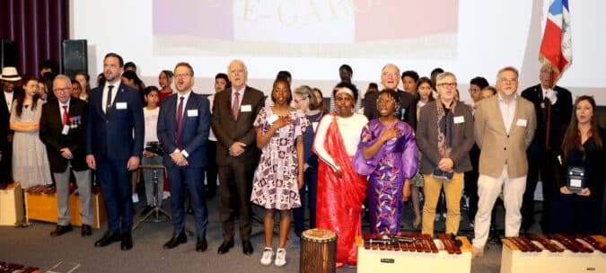 Ludovic Lobjois (directeur ONAC, préfecture), Arnaud Leclerc (DASEN), Jean-Louis Lorca (Conseil départemental), Alain Laporte (Collège Toulouse Lautrec), Romuald De Mena (Collège Toulouse Lautrec), Yamina Fouhami (Collège Toulouse Lautrec) sur l’estrade pour clôturer la Journée citoyenne avec les élèves.
