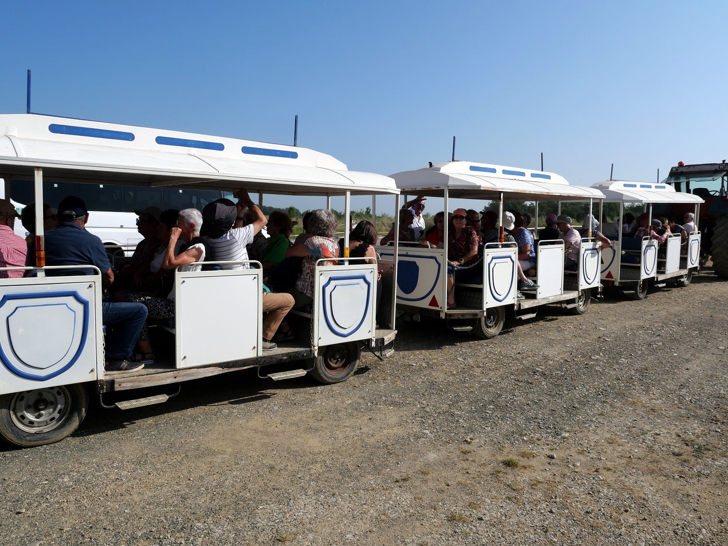 Pas de temps mort dès l’arrivée sur place. La journée commence par un « petit-déjeuner » où croissants et chocolatines sont remplacés par du saucisson, de la saucisse ou encore des tripoux. Le tout arrosé de vins du Tarn (avec modération). On embarque ensuite dans le « tractotrain » piloté par le papa de la propriétaire des lieux. Visite de la ferme et commentaires de Laetitia.