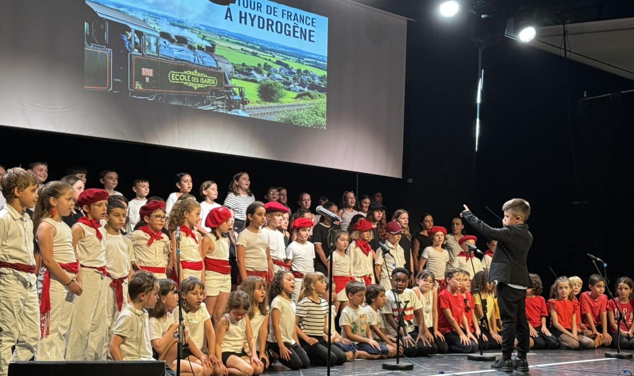 Un véritable spectacle de music-hall, Lilian en chef d’orchestre pour une ouverture avec la chanson de Richard Antony « J’entends siffler le train ». S’en est suivie une série de tableaux sur le thème de l’Arrivée du Train dans la Reine des Pyrénées, arrivée effective depuis 3 jours. Les enfants ont proposés un « Tour de France ! A Hydrogène ». Ils nous ont amené, en chansons, d’un coté à l’autre des Pyrénées, sur les cotés, en Haut de la France. Quelques titres interprétés « Emmène moi voir la mer » (Boulevard des Airs), Hegoak (Joxean Artze et Michel Laboa), « Dans les Prisons de Nantes » (Baudriller, Corbineau,Antoine), « Dimanche aux Goudes » (Masilia Sound Systeme)… Pour une belle fin, chorégraphiée de « Le galop Infernal » d’Offenbach et l’interprétation finale, tous en chœur, de « La Sobirana » (Los Pagalhos).