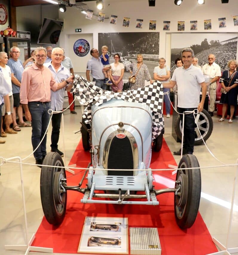 Musée du circuit du Comminges, vendredi 27 juin 2025, Eric Azémar, maire de Luchon, Michel Ribet, président de l'association Les Amis du Circuit, et Jean-Yves Duclos, dévoilent la Bugatti 1924 qui sera exposée jusqu'au 25 septembre.