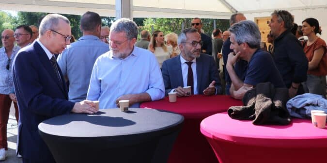 Vendredi 27 juin 2025, inauguration abattoir Saint-Gaudens. Entretiens en aparté, Pierre-André Durand (à g.), Sébastien Vincini et Jean-Yves Duclos (à dr.).