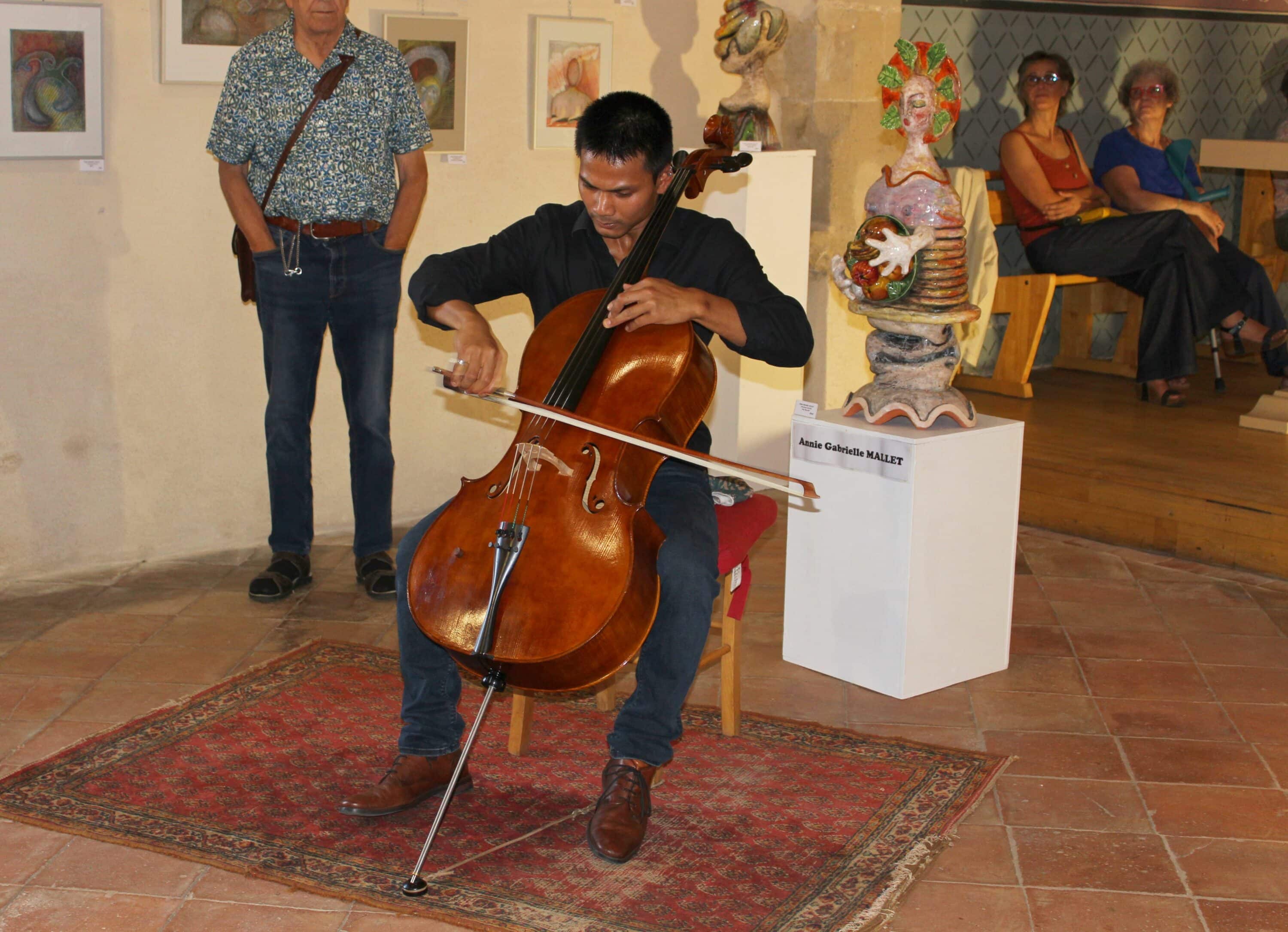 La soirée anniversaire a offert une délicieuse surprise musicale, un concert spontané du violoncelliste Antoine Moulard, s’inspirant des œuvres exposées avec une sensibilité virtuose.