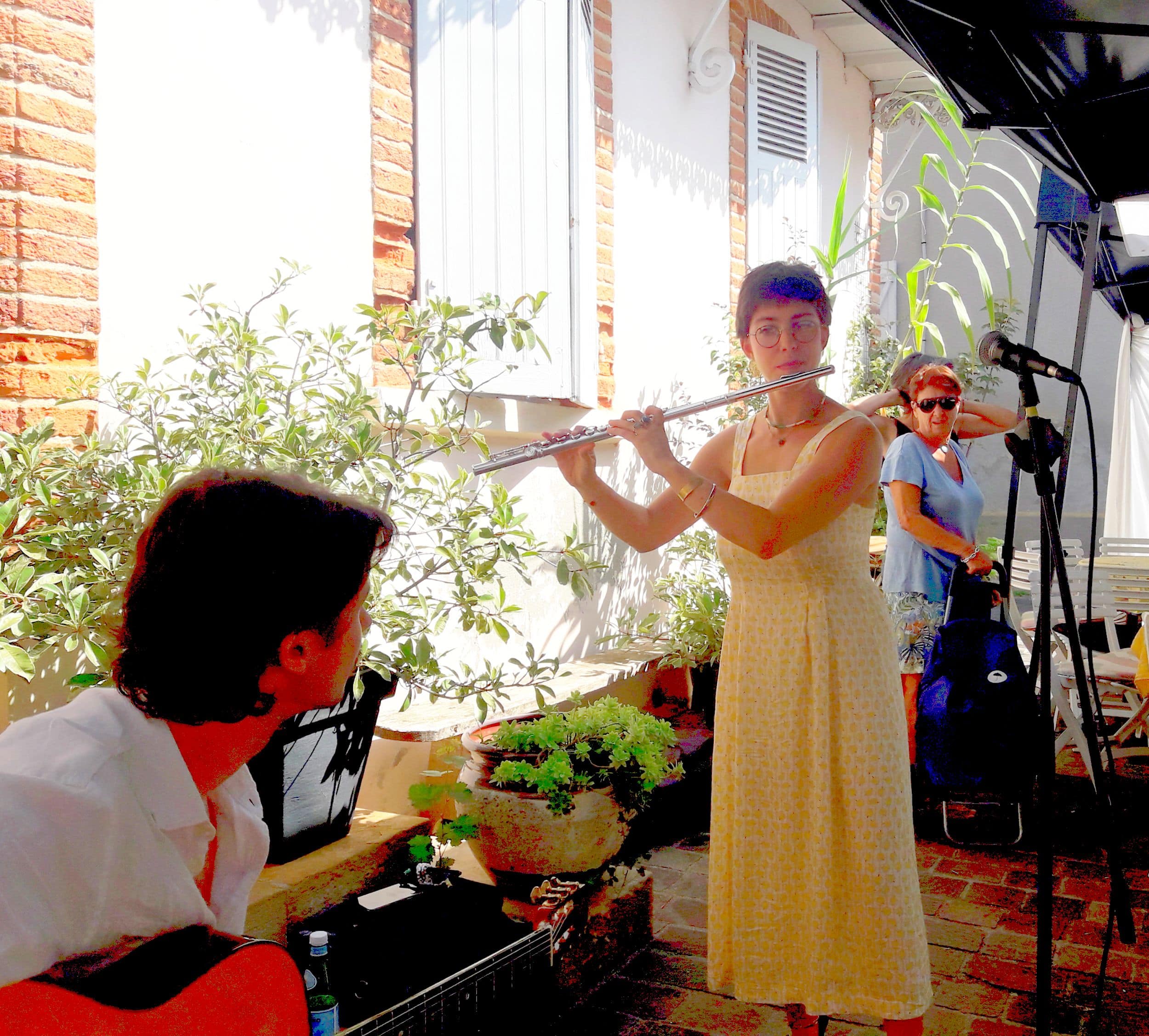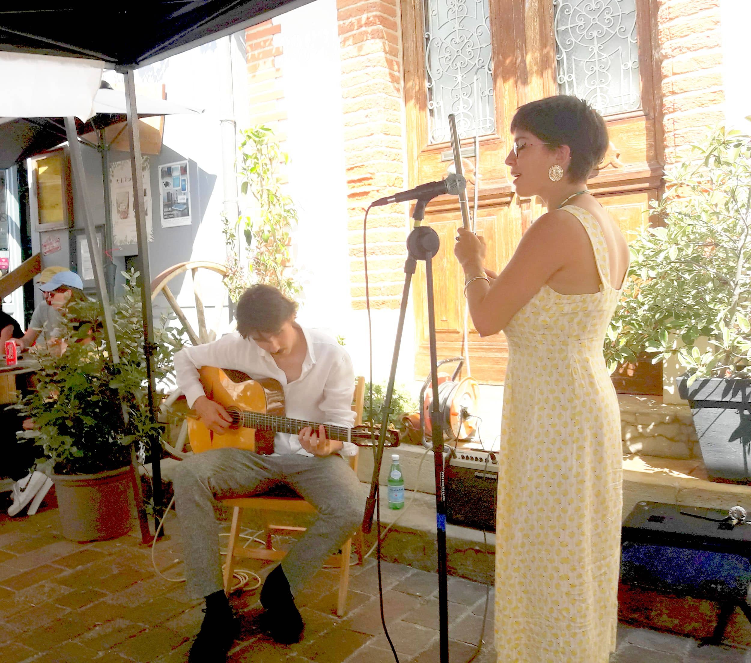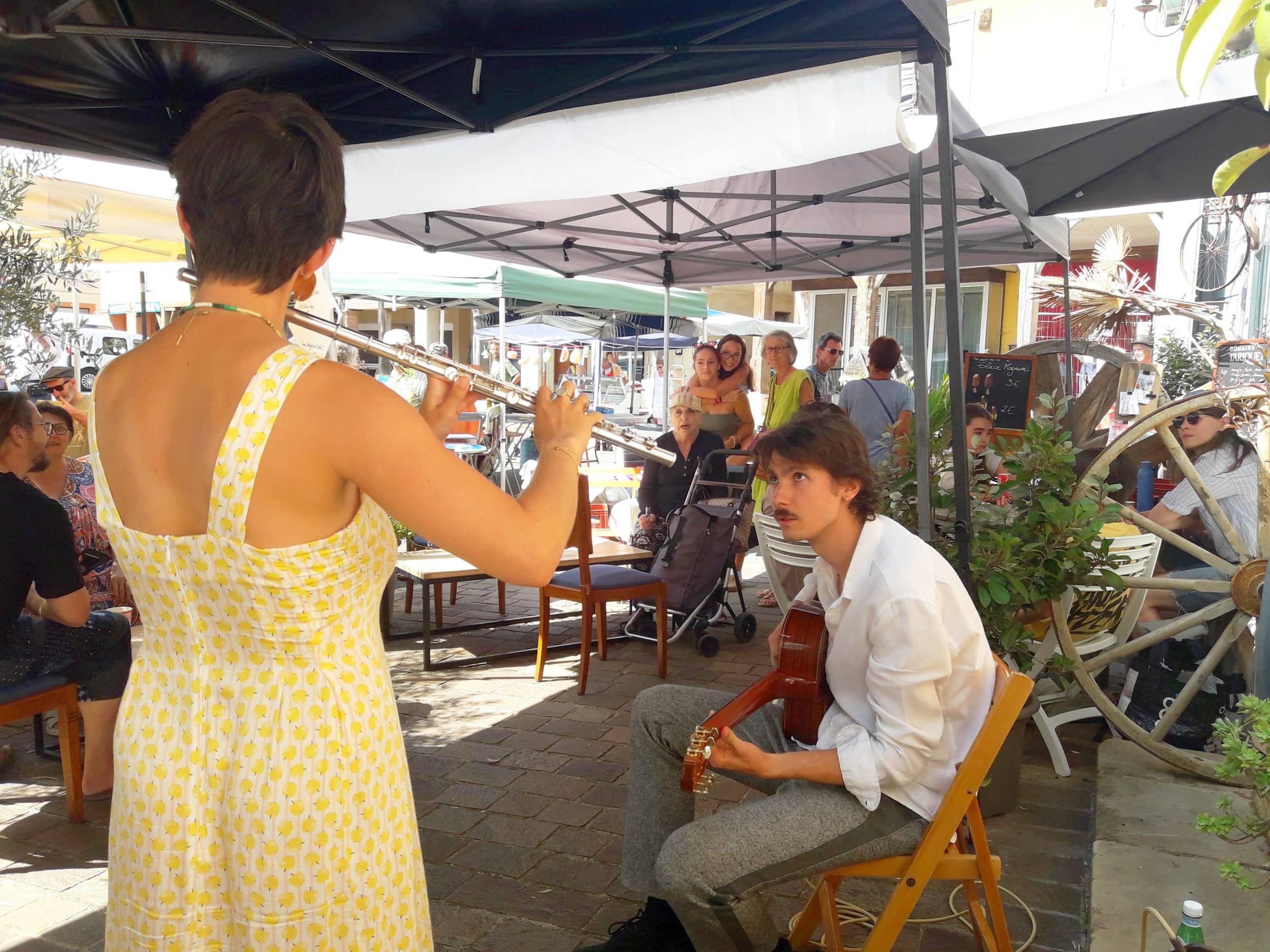 La matinée du 2 août a résonné des accords du Lilou Duo, un couple de jeunes musiciens talentueux, elle venue de Samatan, lui de Paris. Dans le plus pur style manouche le guitariste Antoine Hoel a somptueusement accompagnée Lilou Claverie, chanteuse et flûtistes, à la voix chaude et vibrante, au service des plus belles chansons françaises, Brel, Trenet, Barbara, Boris Vian…, saupoudrées de standards de jazz et de compositions inspirées. Sous le soleil de l’été, la vie est belle en musique à L’Isle en Dodon avec Lilou Duo.