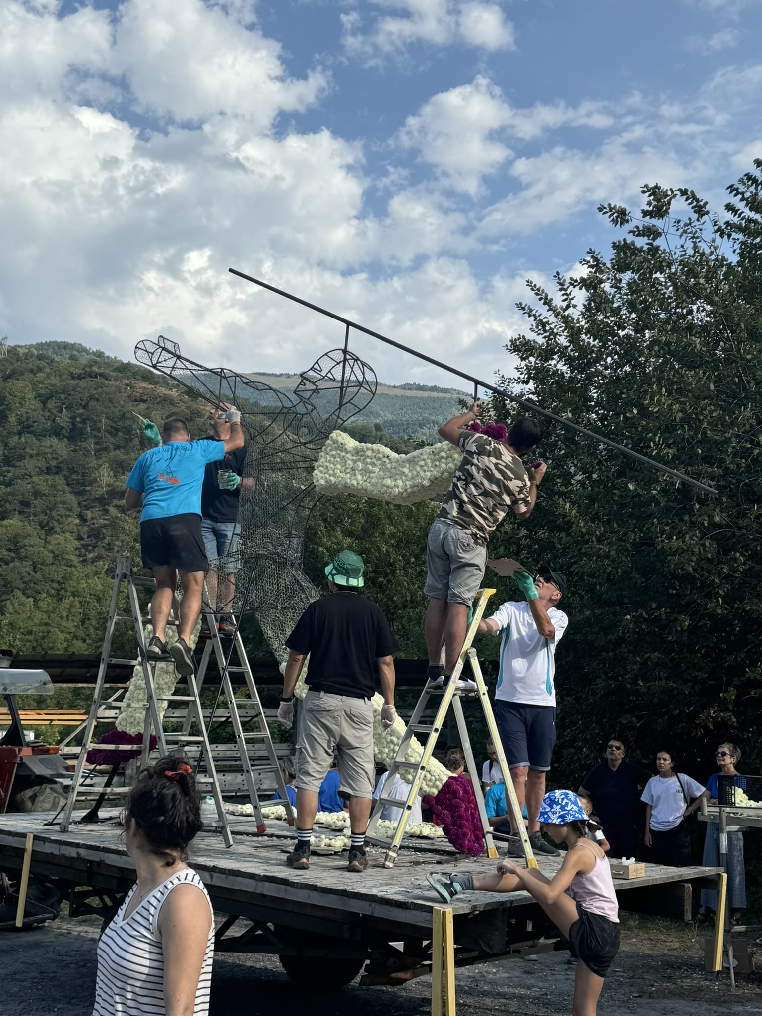 Les membres des diverses associations, mais aussi, commerçants, touristes, vont pendant 2 jours coller des fleurs naturelles sur les carcasses confectionnées par les serruriers de la ville. Les passants s’arrêtent, admirent, on leur tend une fleur…Des milliers de reines marguerites, oeillets, chrysanthèmes, vont être collées sur les belles structures, qui cette année devrait mettre en évidences, avions, trains, bateaux, vélos…tous ces moyens de transports qui ont évolués tout au long des siècles. De véritables œuvres artistiques, éphémères, puisque tout sera dépecé lors du dernier passage du défilé sur les allées d’Etigny dimanche en fin d’après-midi.