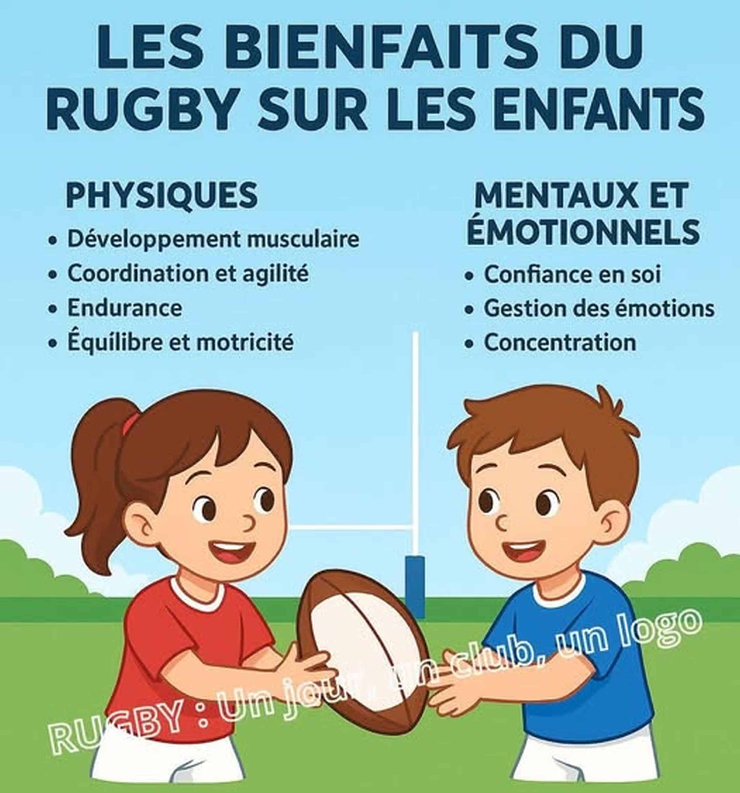 Rappel : Les bienfaits du rugby pour les enfants, développement musculaire, agilité, coordination, endurance, équilibre, motricité, confiance en soi, gestion des émotions, concentration, interaction avec les autres…