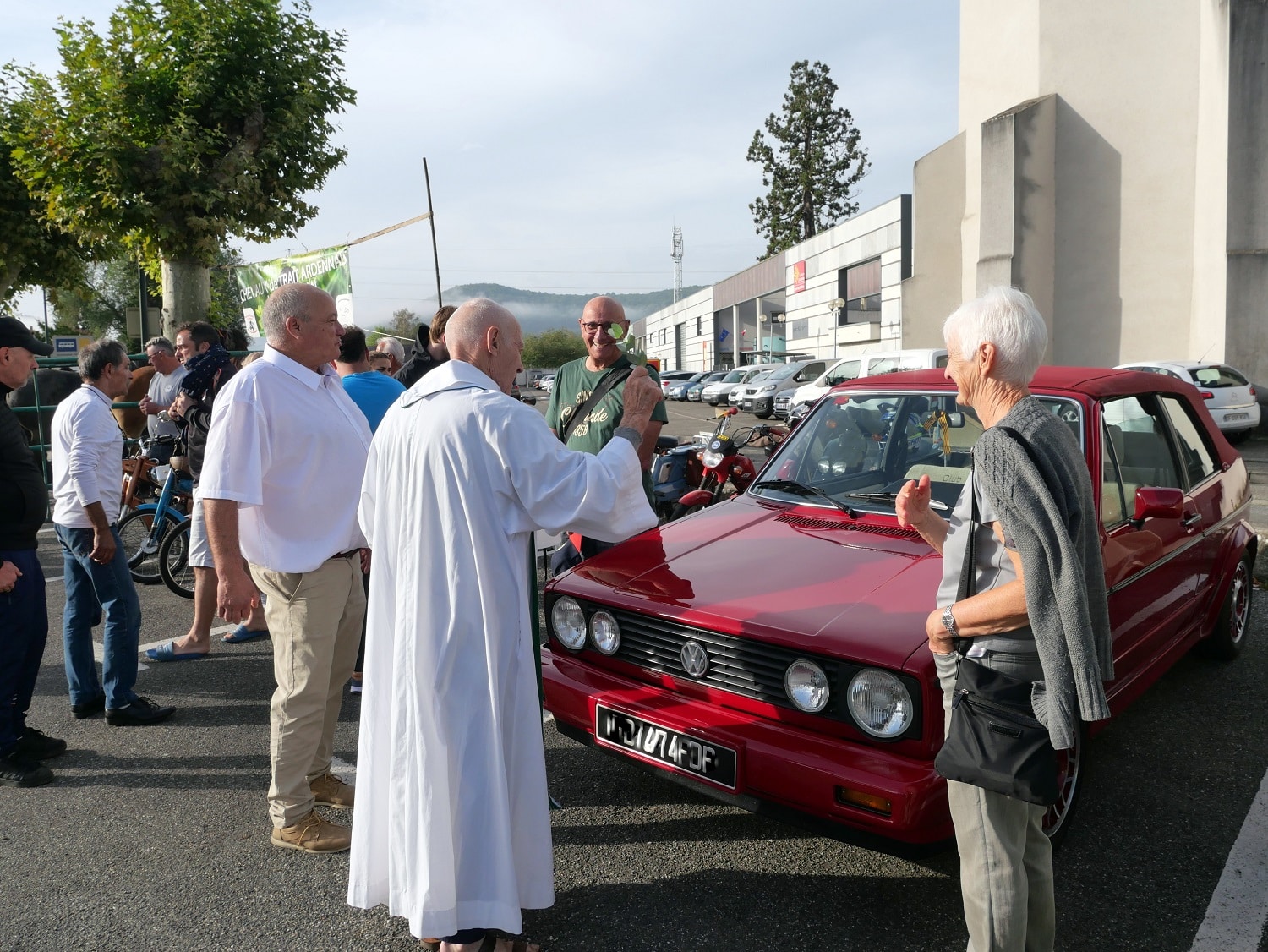 Avant de célébrer la messe, Père Dominique (prêtre « retiré »), bénissait mobs, motos, voitures de collection et leurs propriétaires. Après la messe, les belles mécaniques allaient faire un tour de ville. Ensuite, direction Saint Bertrand de Comminges pour la photo souvenir au pied de la cathédrale Sainte Marie.