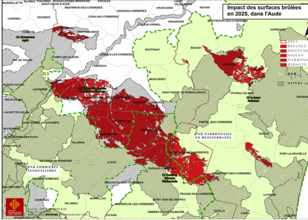 En août, le département de l’Aude a été frappé par l’incendie le plus dévastateur sur le territoire national depuis 1949.Ce sinistre a coûté la vie à une habitante, blessé grièvement deux pompiers et détruit 37 maisons.Ce sinistre a coûté la vie à une habitante, blessé grièvement deux pompiers et détruit 37 maisons. Près de 17 000 hectares sont partis en fumée dans les Corbières et le Lézignanais, en plein cœur d’une zone Natura 2000 d’une grande richesse écologique. Ce feu, précédé de quatre autres dans l’Aude (Bizanet, Douzens, Bages-Narbonne, Sigean-la Palme – 2 600 ha), a ravagé des vignes, la biodiversité des exploitations agricoles, des entreprises et un territoire à forte attractivité touristique, tout en marquant à jamais une population traumatisée par des semaines d’angoisse et de lutte contre les flammes.