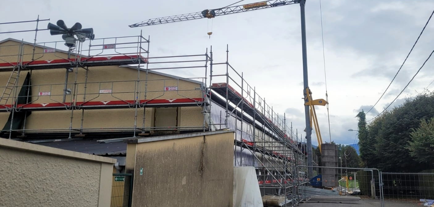 - Réfection de la toiture endommagée par les orages de grêle, avec dépose du toit en amiante au profit d’une nouvelle toiture en panneaux sandwich, et renfort de la structure par l’entreprise SOGEP (Société Générale d’Entreprises Pyrénéennes), en vue de l’installation de panneaux solaires photovoltaïques par le SDE 65.