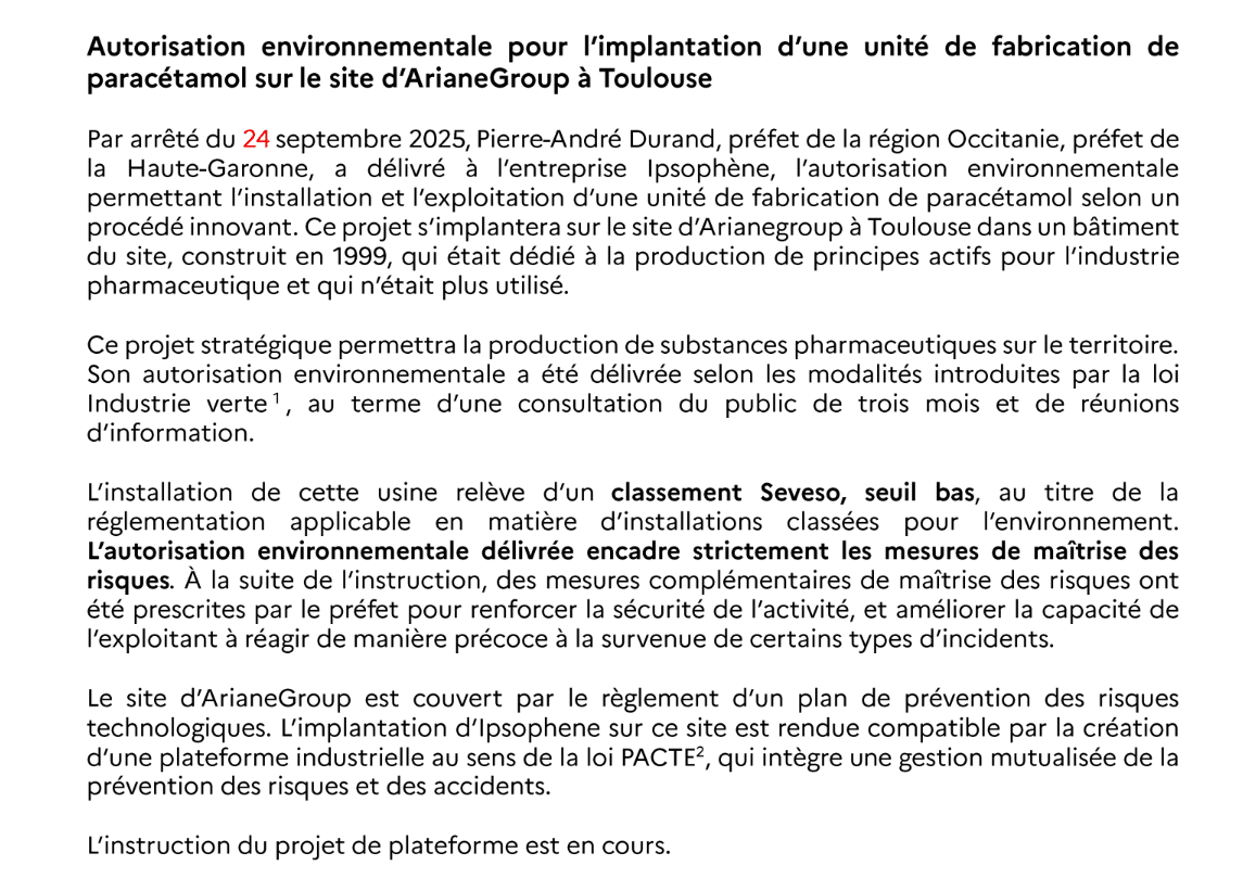 Accueil » Toute l’actualité » Toulouse : Autorisation environnementale pour l’implantation d’une unité de fabrication de paracétamol sur le site d’ArianeGroup à Toulouse