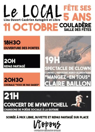 Pour souffler ces 5 bougies, Utopons convie le public à une grande soirée spectacle/concert à la salle des fêtes de Couladère ce samedi 11 octobre. Au programme :