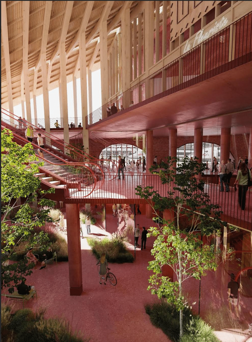 Projet d’envergure pour le rayonnement et l’attractivité de Toulouse, la conception de la Halle des mobilités a été soumise à un concours d’architecture remporté par l’agence Bjarke Ingels Groupe et dirigée par l’architecte danois Bjarke Ingels. Le bâtiment est conçu avec un objectif de Bâtiment Durable d’Occitanie : toiture en tuiles photovoltaïques, construction bois, raccordement aux réseaux de chaleur et d’eau tempérée urbains, matériaux biosourcés, récupération d’eau de pluie, végétalisation, etc.