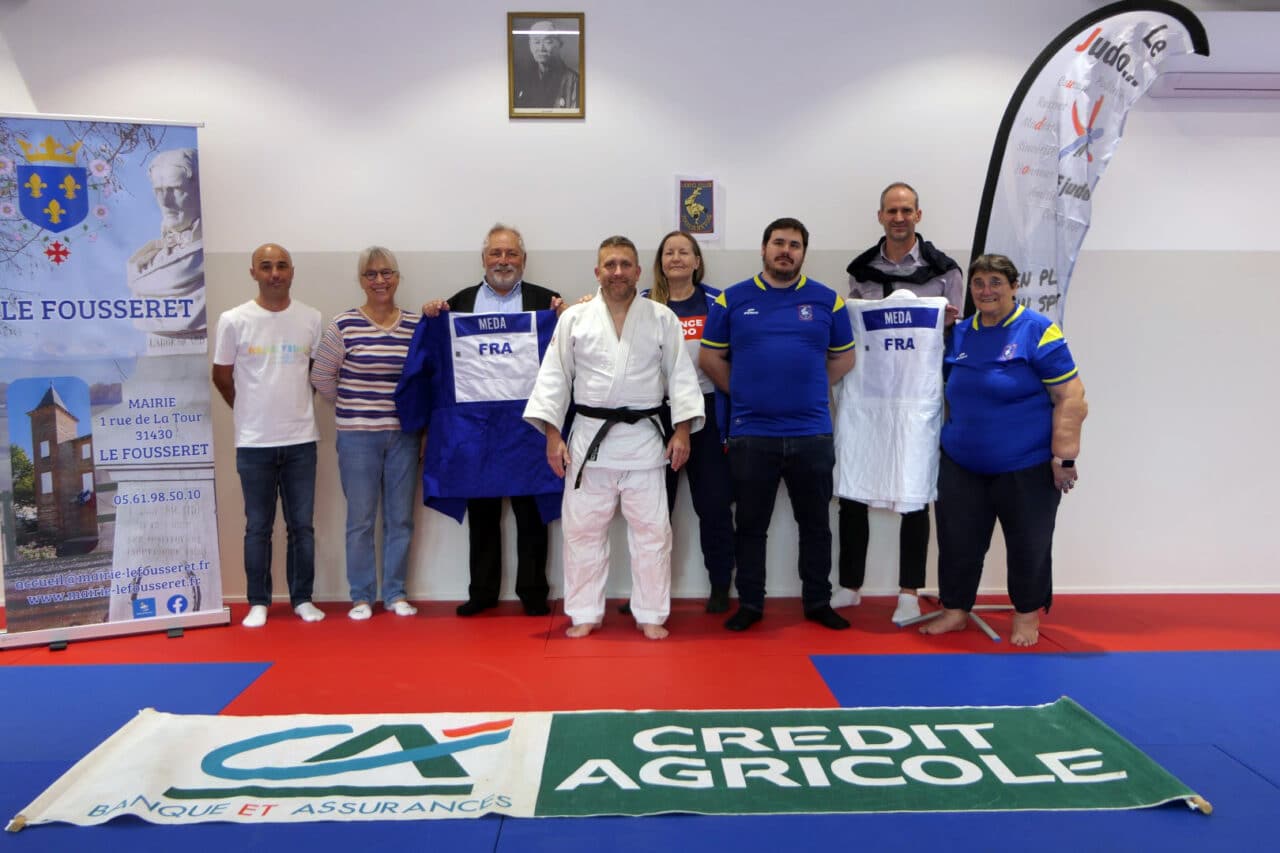 Étaient réunis autour de l’athlète Patrick Méda : Pierre Lagarrigue, Maire du Fousseret, Cédric Banuls, premier adjoint, Monsieur Tachier et Madame Éliane De Min, respectivement directeur des agences Volvestre et Présidente du Conseil d’Administration du Crédit Agricole et le bureau du Judo Club Fousseretois.