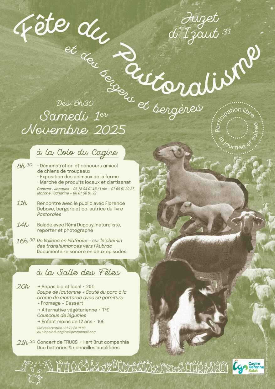 La journée ne sera pas finie ! Après avoir passé la journée sur le lieu de La Colo du Cagire, le collectif vous propose de continuer la Fête du Pastoralisme et des bergers et bergères à la Salle des fêtes de Juzet d’Izaut. - 20h : on passe à table ! Repas bio et local. Soupe de l’automne + Sauté du porc à la crème de moutarde avec sa garniture+ Fromage + Dessert, 20€. Alternative végétarienne (Couscous de légumes) 17€, tarif enfant moins de 12 ans – 10€