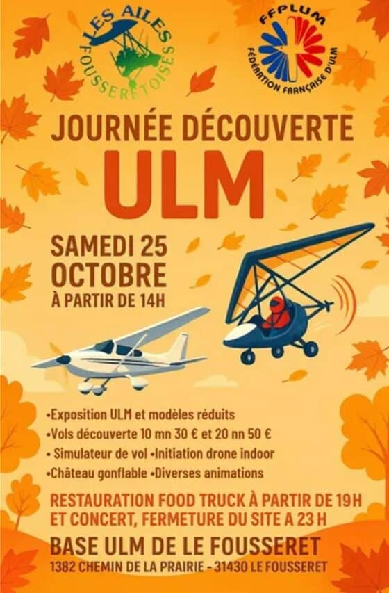 Une journée à la découverte de l’ULM est organisée par l’association Les ailles Fousserétoises le samedi  25 octobre 2025 à partir de 14h sur le  terrain d’ULM de Le Fousseret. Le dimanche 26 se tiendra également un rassemblement d’ULM et de véhicules anciens avec un repas le midi.