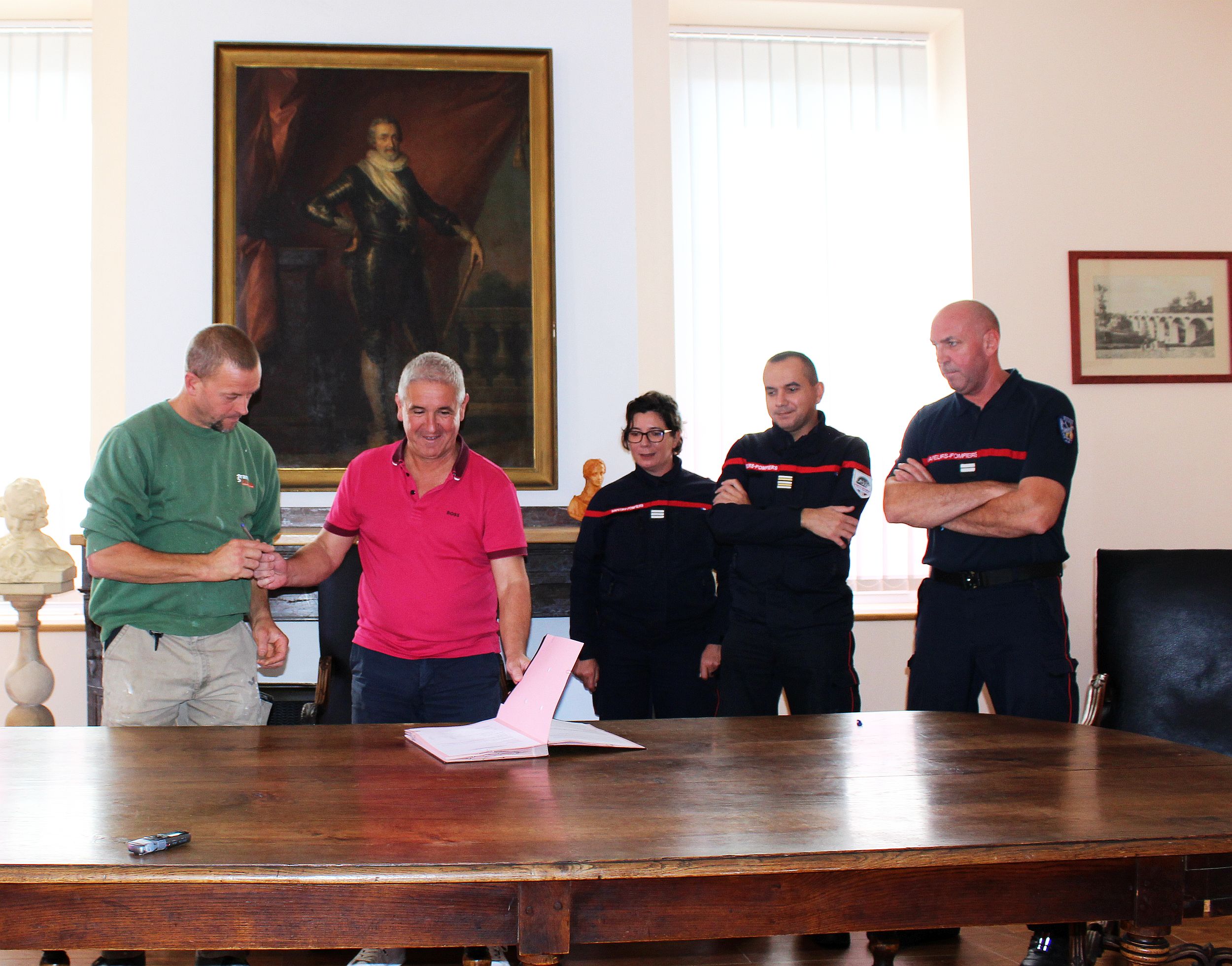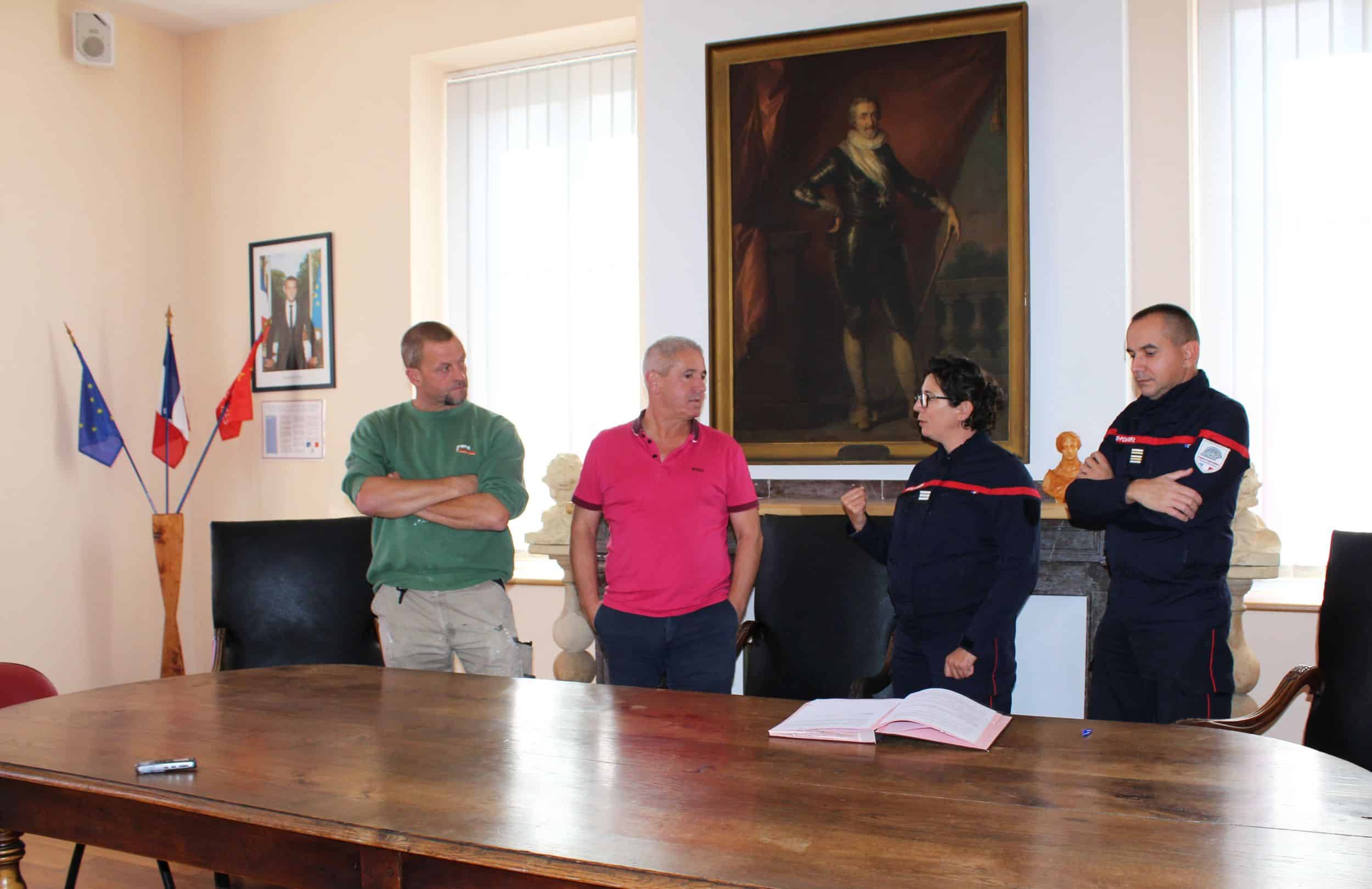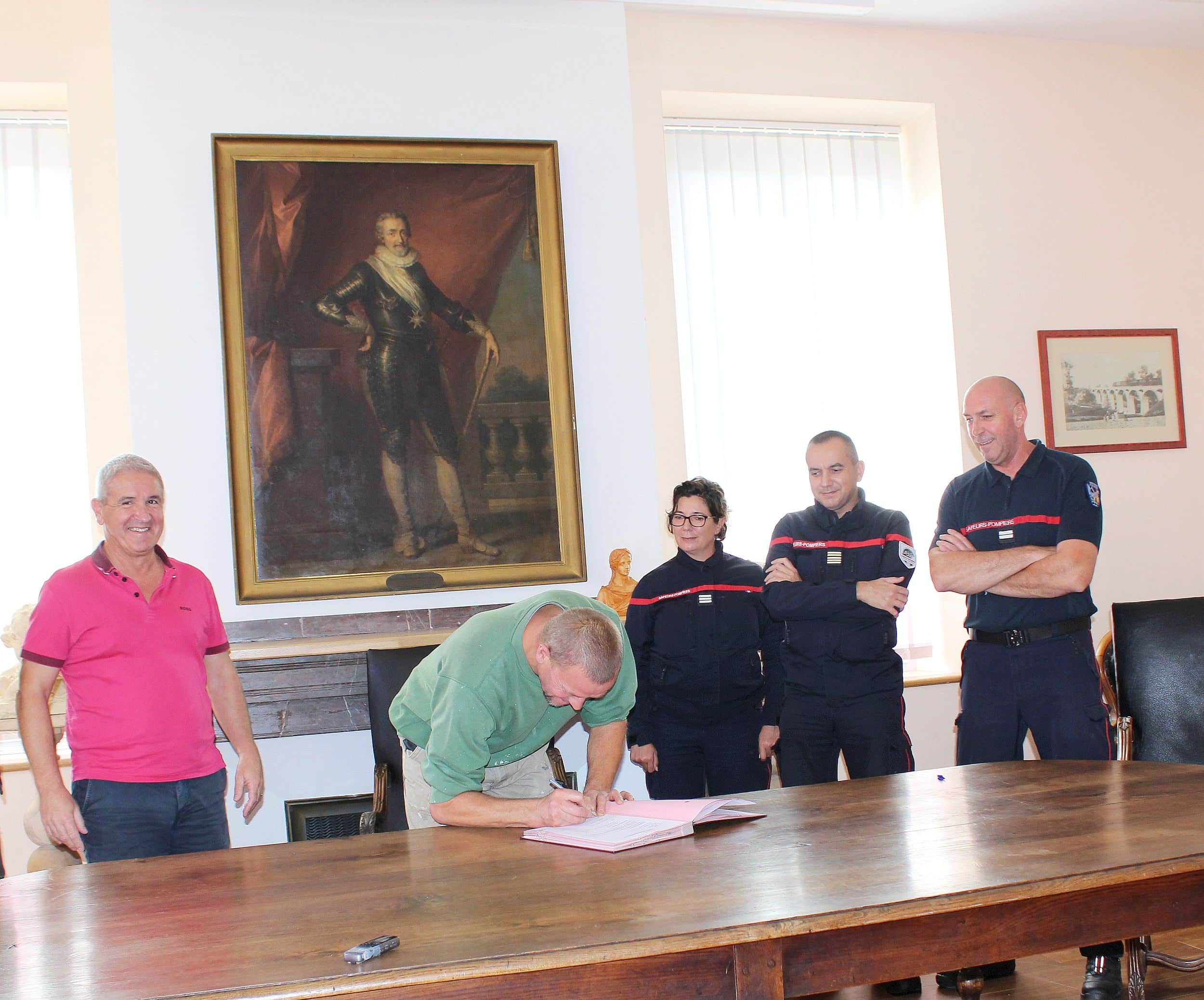 Dans la salle d’apparat de la Mairie, une convention de disponibilité a été signée par Alain Boubée, maire de Boulogne, et le lieutenant-colonel Nicolas Morlans, commandant en chef du Département Sud 31. Cette convention concerne l’agent communal Sébastien Lozes, sapeur-pompier volontaire à la caserne de Boulogne, afin qu’il puisse accomplir ses missions au mieux, sur son temps de travail. A leurs côtés, étaient présents le capitaine Emma Ducros, cheffe du Service Volontariat, le maire-adjoint Yves Bon, et le lieutenant Stéphane Pagotto chef du centre de secours et d’incendie de Boulogne.