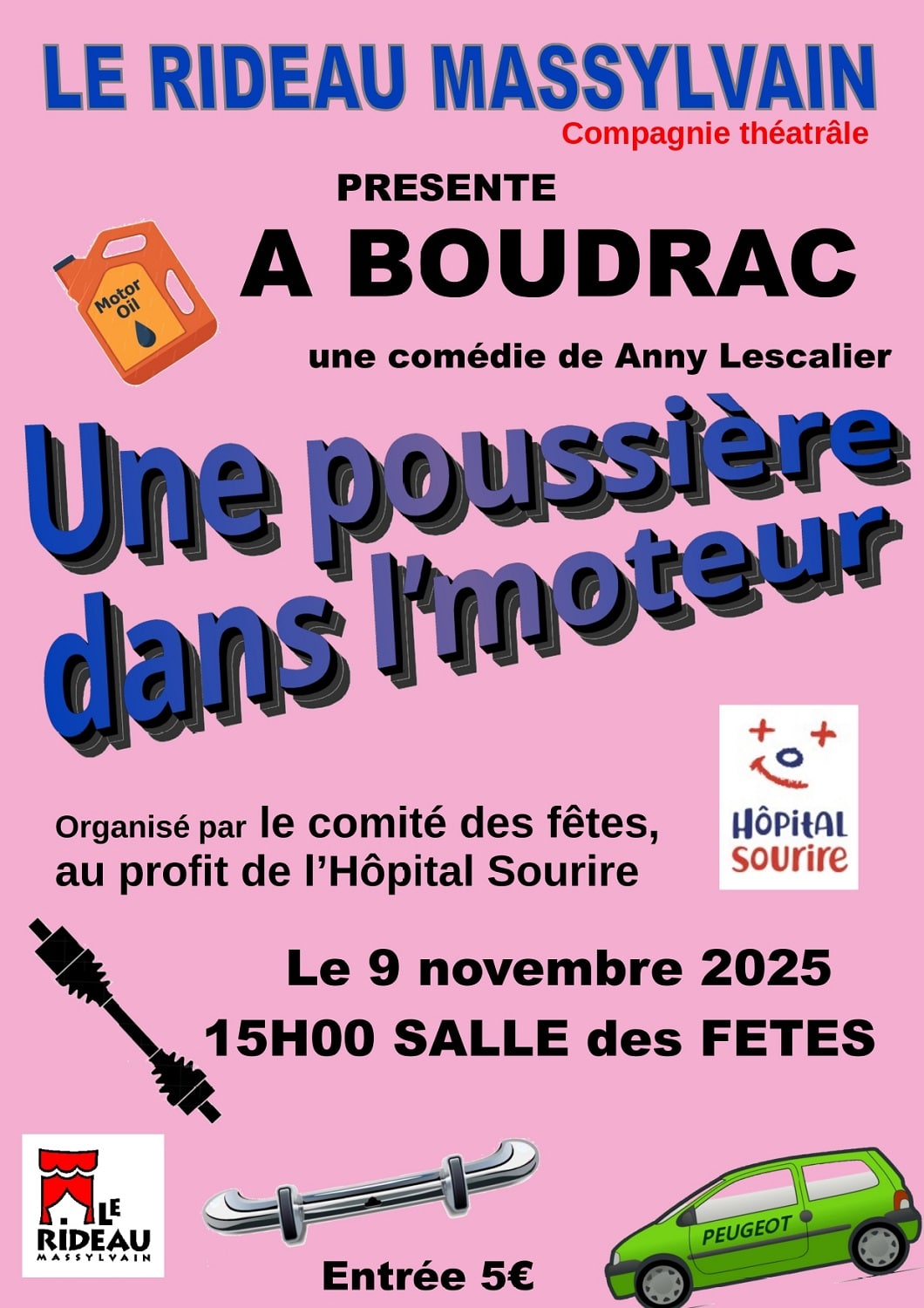 Le rideau Massylvain présente une comédie de Anny Lescalier : Une poussière dans l’moteur. La journée de Bruno Coquillot, garagiste magouilleur, s’annonce mouvementée. Il doit gérer l’arrivée d’une secrétaire intérimaire gaffeuse et bavarde, l’absence de son fils parti accepter un travail dont il ne veut rien dire, et les clients qui défilent ! Parmi eux, ceux qu’il est facile d’arnaquer, et ceux qu’il faut séduire, surtout quand il y a un intérêt la clé…