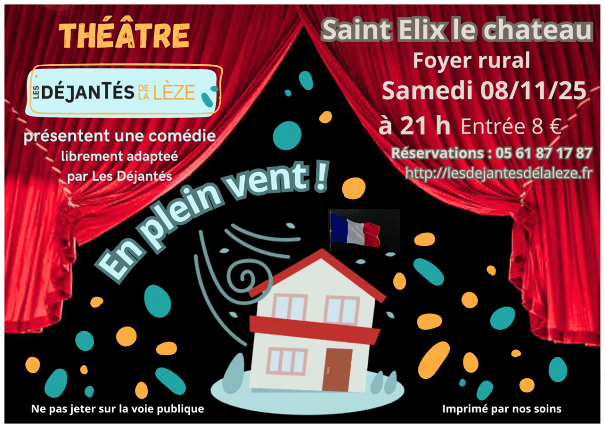 Le foyer rural de Saint-Elix-le-château accueillera la troupe de théâtre Les déjantés de la Lèze qui joueront leur nouveau spectacle « En plein vent », le samedi 8 novembre à 21h00.