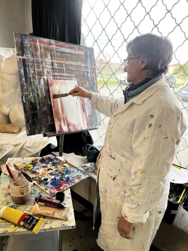 Elle se nourrit de ses voyages à travers le monde, transposant ses souvenirs visuels en compositions où les dégradés et les formes s’entrelacent harmonieusement. L’influence du sud de la France se retrouve dans ses tableaux à travers l’utilisation de couleurs flamboyantes qui captent et reflètent la lumière avec éclat.