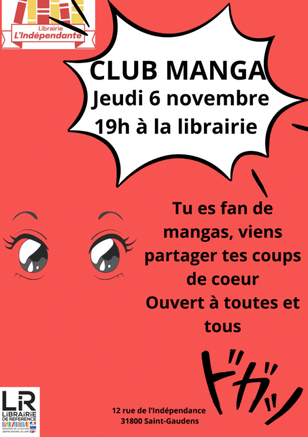 Un club mangas se tiendra à la librairie L’Indépendante de Saint-Gaudens le jeudi 6 novembre à 19h, animé par Sylvain (l’un des gérants de la librairie) et Fabien (un passionné et fin connaisseur du manga et de l’univers des animés japonais).