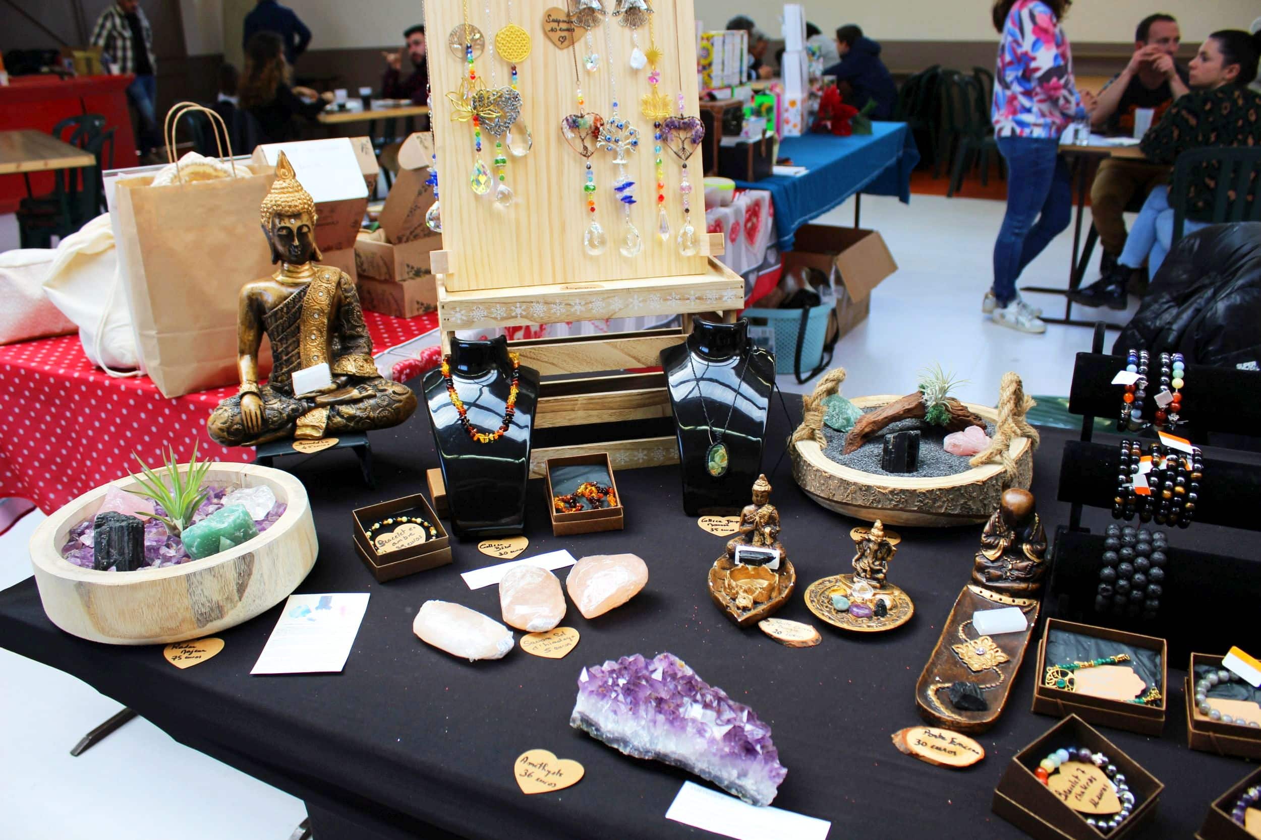 Sur les deux jours, exposition des créateurs : céramiques, tissus, bijoux, photographies, cartes à jouer, fleurs, bois, pierres d’énergie, crochet, savons, roman…
