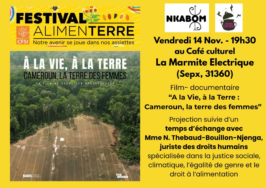 En prenant comme sujet central l’adaptation face aux dérèglements climatiques, ce documentaire met en lumière le rôle essentiel des femmes dans l’agriculture et la préservation de la biodiversité au Cameroun. De nombreux enjeux sont abordés dans le film, notamment celui de la déforestation et des monocultures industrielles. Grâce à des témoignages saisissants, le film A la vie, A la Terre : Cameroun, la terre des femmes illustre les luttes locales et les initiatives individuelles et collectives pour préserver les terres et s’adapter à un environnement de plus en plus menacé. Le film offre un outil précieux pour sensibiliser aux enjeux environnementaux et aux injustices sociales en Afrique Centrale, avec des parallèles possibles en France et dans d’autres territoires.