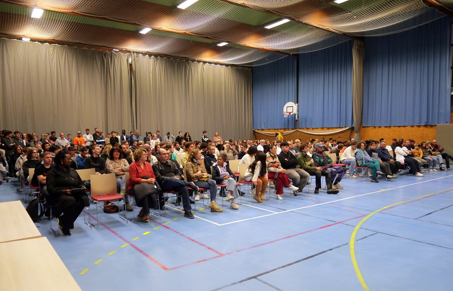 Vendredi 7 novembre 18h dans le grand gymnase aménagé pour l’occasion. Un pupitre, deux micros, les drapeaux français et européen. En face, des chaises pour recevoir les élèves et leurs familles. A sa droite, d’autres chaises destinées aux professeurs. Le proviseur, Pascal Moureau en poste depuis la rentrée, avait revêtu une toge doctorale du plus bel effet.