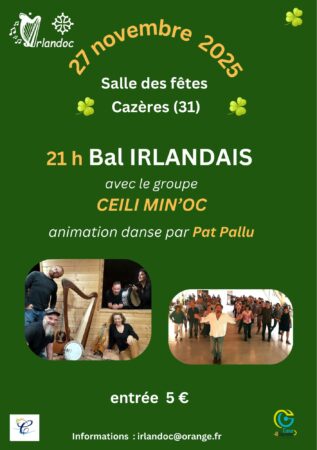 Une fois n’est pas coutume, l’association Irland’Oc organise un bal irlandais ce jeudi 27 novembre 2025 à 21h à la salle des fêtes Michel Bon. Au programme, le groupe Ceili-Min’Oc et l’animateur Pat Pallu. L’idée étant de programmer d’autres bals chaque trimestre le jeudi (occitan ou irlandais).