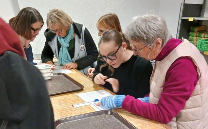 Élèves plongées dans l’examen du fonctionnement de l’établissement présenté par des bénévoles.