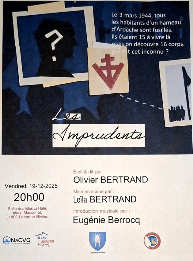 Vendredi 19 décembre 2025, 20h00, spectacle «Les Imprudents», écrit et dit par Olivier Bertrand, salle des fêtes La Halle, centre village, Labarthe-Rivière. Libre et gratuit.