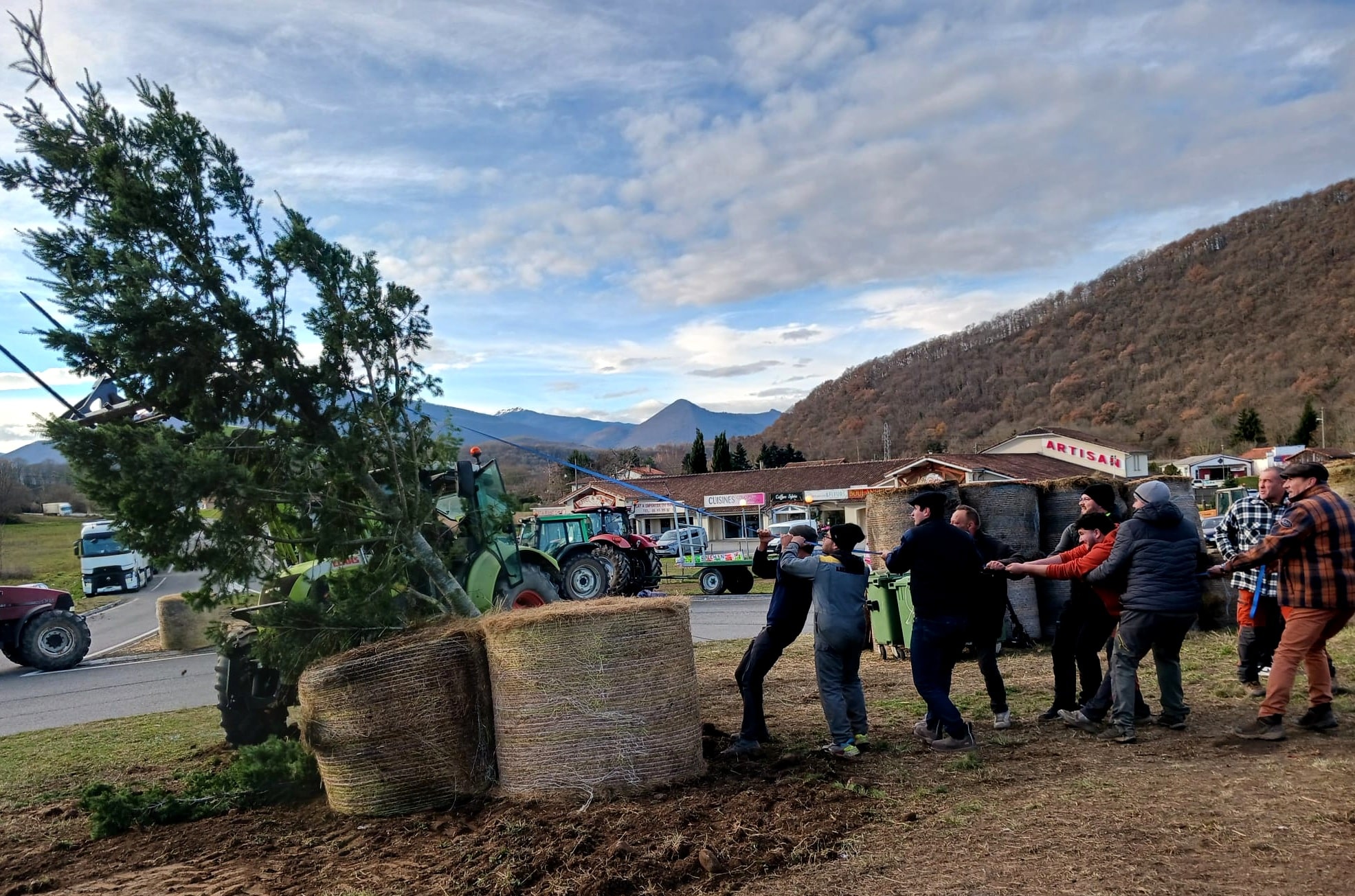 Mardi 16 décembre 2025 au matin, rond point du Bazert à Gourdan-Polignan, les agriculteurs érigent un sapin de Noël.