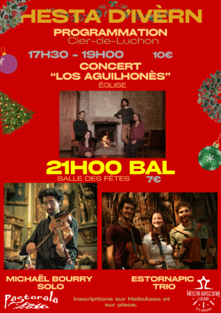 A Cier de Luchon, ce samedi 20 décembre avec la Pastorala, Stage de chants traditionnels de 14h à 17h avec Michaël Bourry. Concert du groupe de chant « Los Aguilhones » 17h30 19h à l’Église chauffée de Cier. Repas et Bal avec le Groupe Estornapic. Encore des places