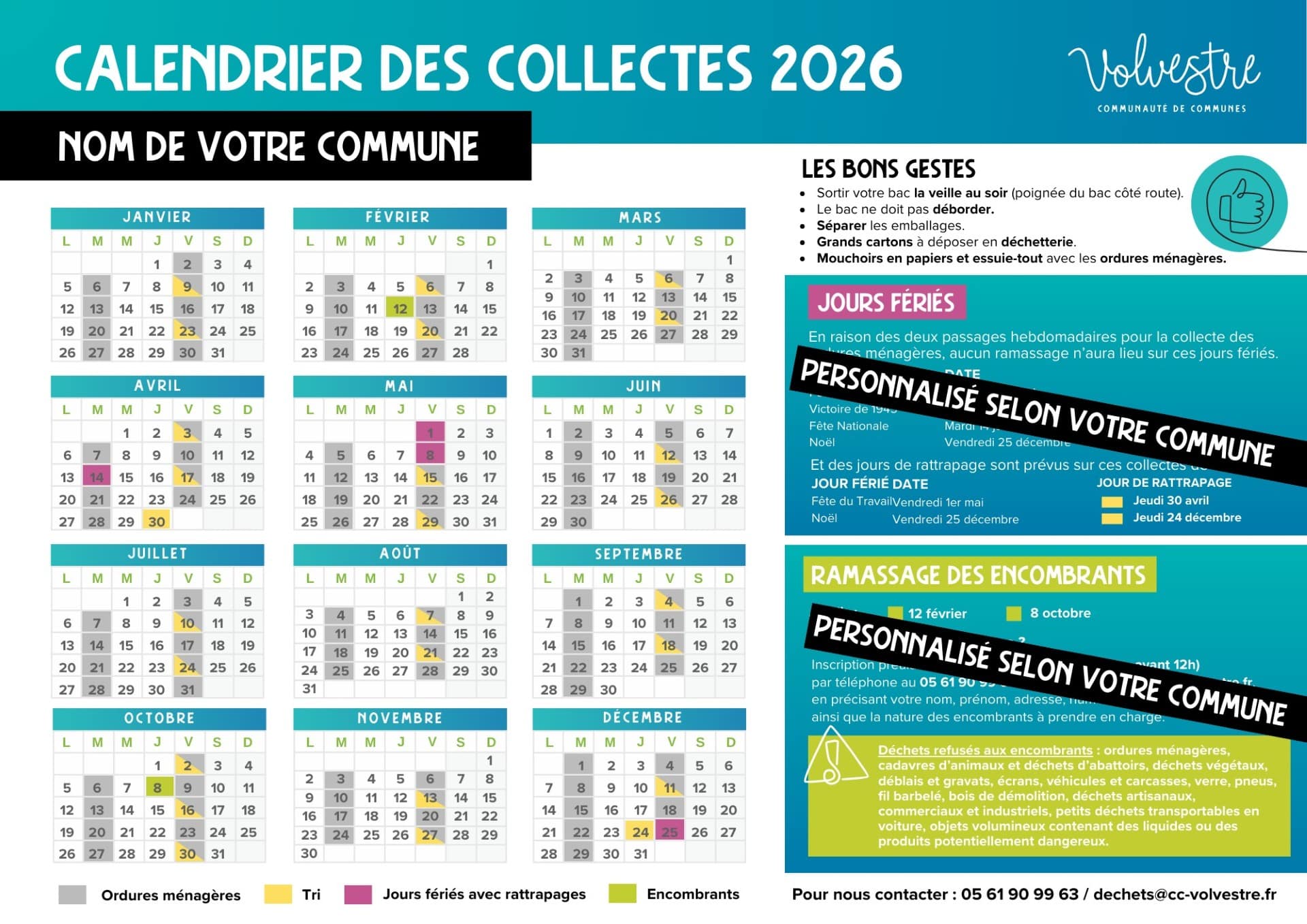 Les calendriers de collecte des déchets pour l’année 2026 sont désormais disponibles sur le site internet de la Communauté de Communes du Volvestre.